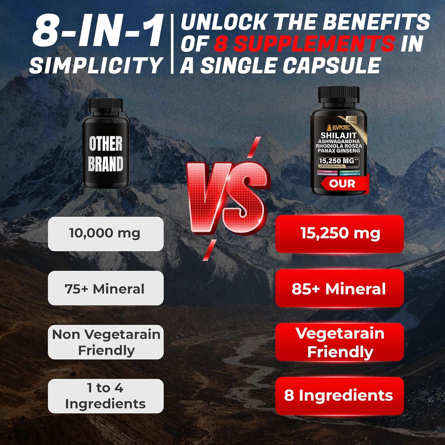 🌱 Packed with a potent blend of Shilajit Supplement, Ginkgo Biloba, Ashwagandha Capsules, Rhodiola Supplement, Panax Ginseng, Turmeric Powder, Stinging Nettle, and Cordyceps Mushroom it offers an abundance of benefits. Say goodbye to the clutter of countless supplements in your cabinet and make room for a single solution. Elvpotec presents a groundbreaking 8-in-1 formula Nature’s Synergy Solution.