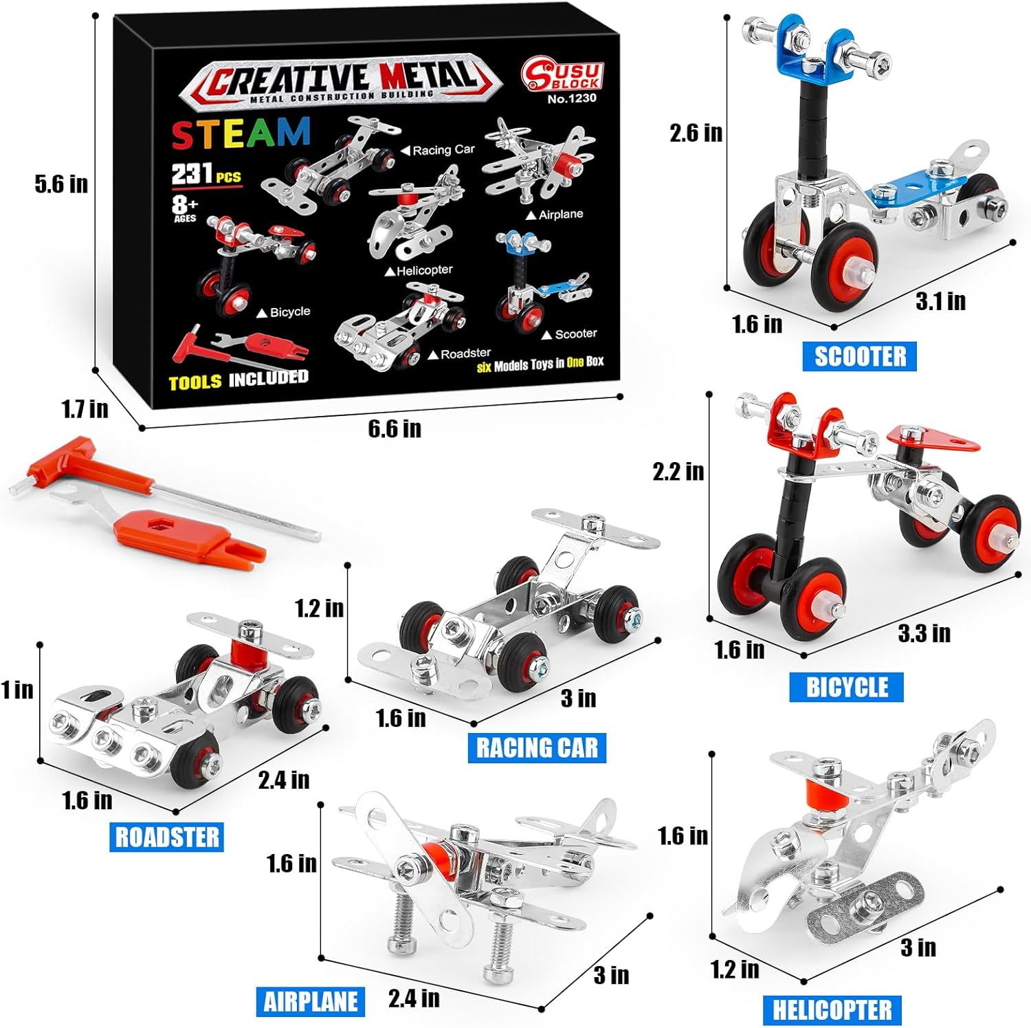 Erector Set Metal Transportation Toys,231 Pcs Cars, Airplane&Bicycle 6 Metal Model Set,Building Kits for Boys 8-12,Stem Project Building Assembly Vehicles,Christmas Toddler Kids Boys Gifts