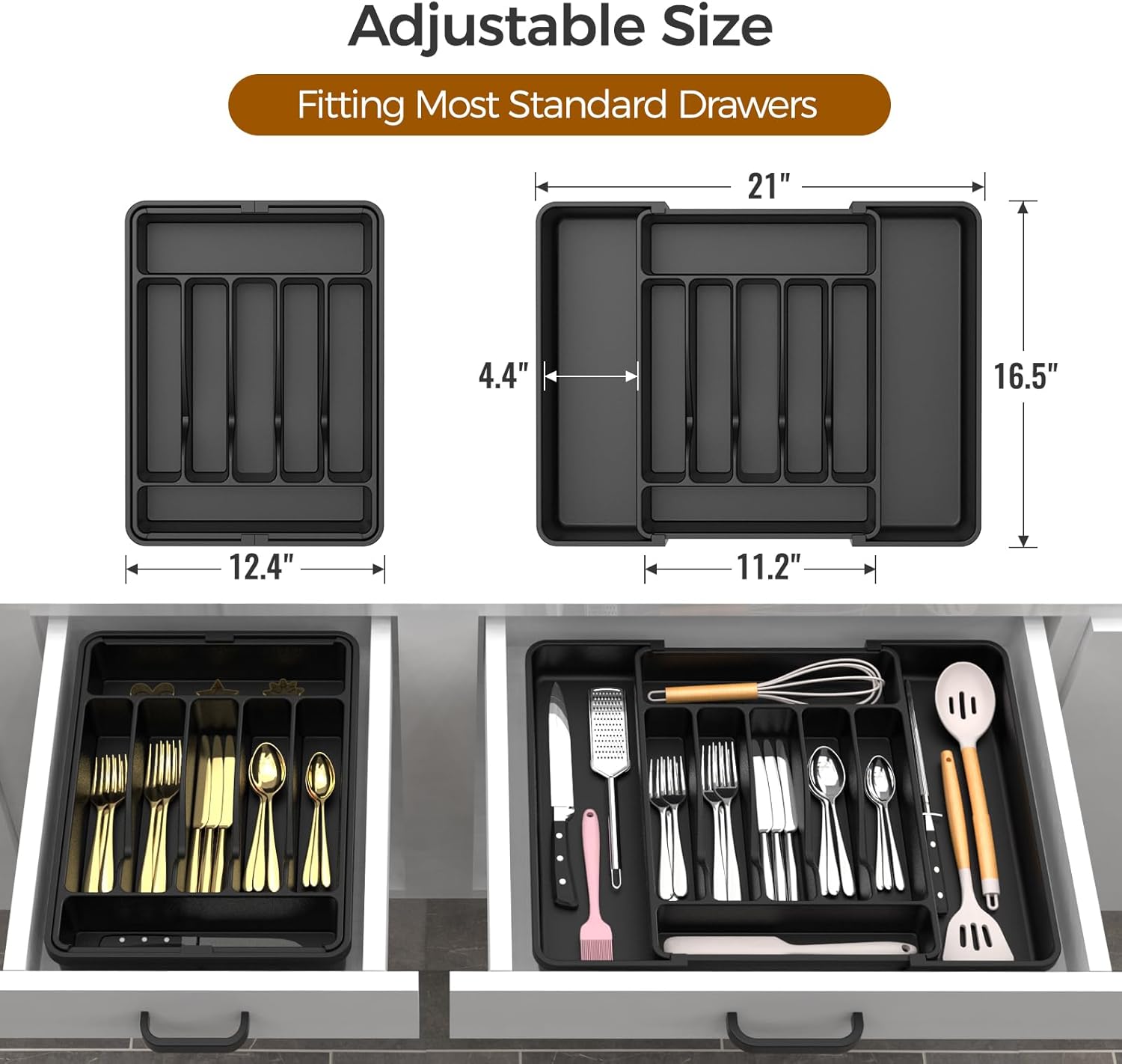 【Adjustable Size】:The width of the utensil drawer organizer expands from 12.4″ to 21″, perfectly fitting most standard drawers. (Measure your drawer before buying for the best fit).