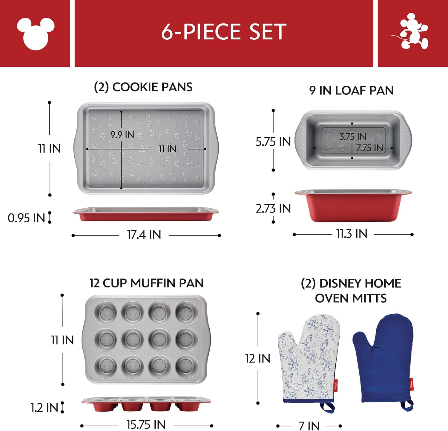 Farberware Disney Bake with Mickey Mouse Nonstick Bakeware Set/Baking Pans with Disney Home Oven Mitts, Cookie Pans, Muffin/Cupcake and Loaf Pan, 6 Piece Non Stick Bakeware Set – Red