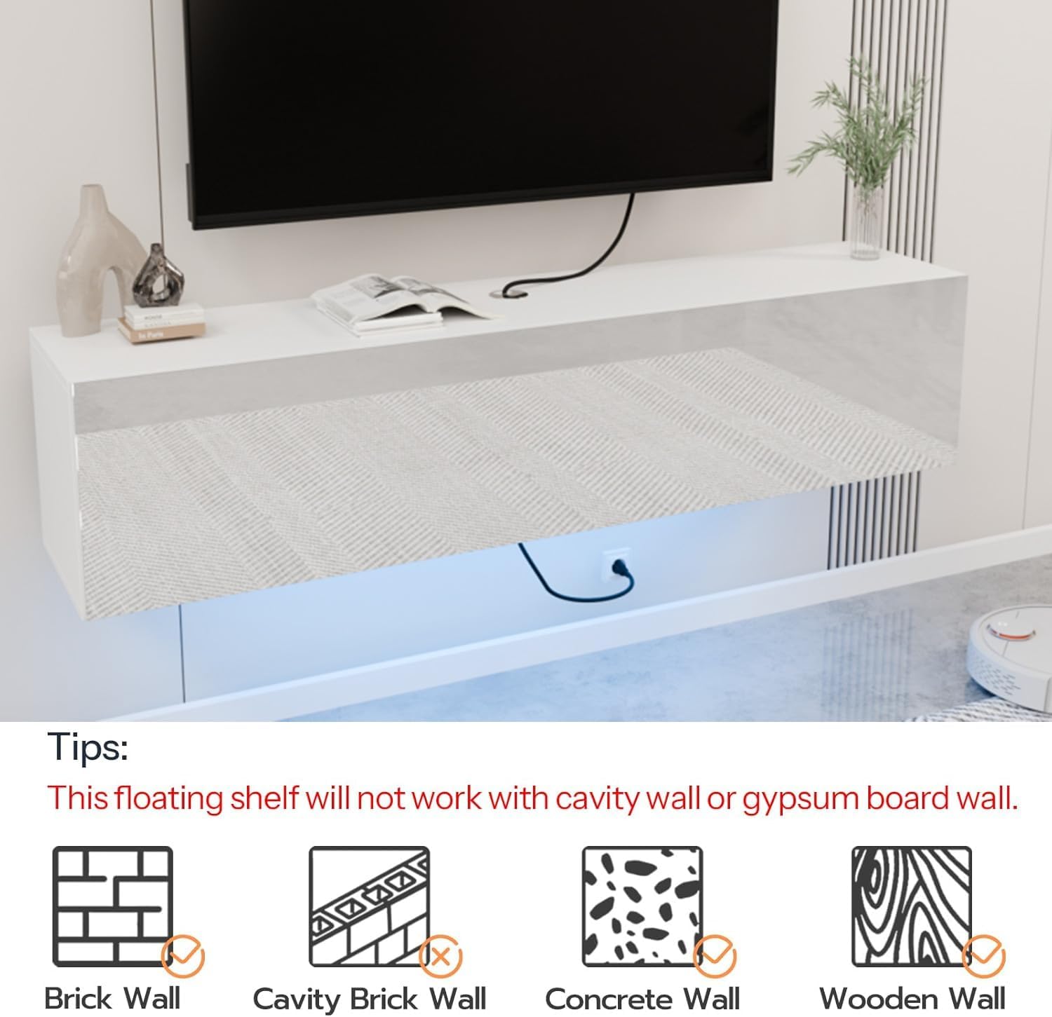 【Modern TV Stand】 White high glossy finish floating LED TV stand with a modern look and a beautiful appearance which reflects out your high-end and stylish aesthetic. The smooth paint is very easy to clean, dust and oil stains are easier to wipe off (Only the front surface is glossy)