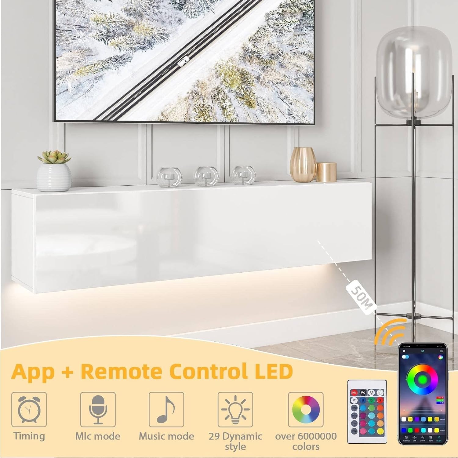 【Modern TV Stand】 White high glossy finish floating LED TV stand with a modern look and a beautiful appearance which reflects out your high-end and stylish aesthetic. The smooth paint is very easy to clean, dust and oil stains are easier to wipe off (Only the front surface is glossy)