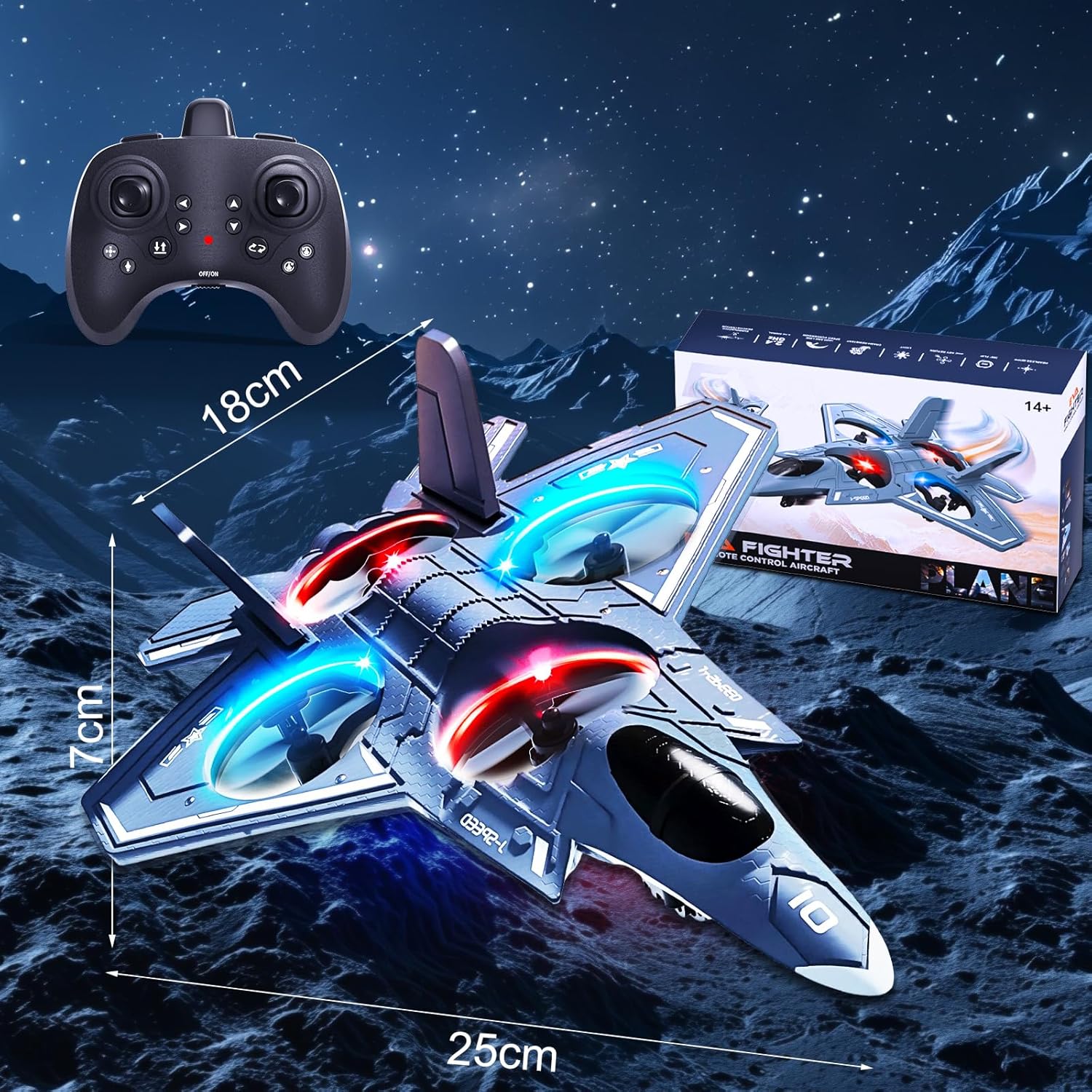 【Vivid LED Night Flight】Equipped with bright LED lights, this RC plane shines brilliantly against the night sky. As the sun sets, it becomes a captivating spectacle, painting trails of light with every maneuver. Perfect for family camping trips, evening gatherings, or backyard fun, it extends playtime into the night and creates unforgettable magical moments. Its eye-catching glow stands out everywhere, from suburban neighborhoods to community events.