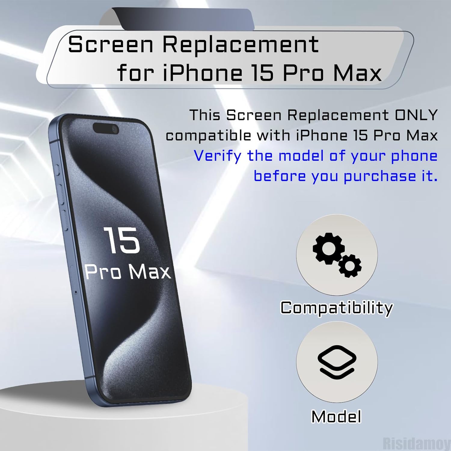 【Compatible Model】The screen replacement ONLY Compatible with iPhone 15 Pro Max 6.7″, Model: A3106 A2849 A3105 A3108. Verify your phone’s model number before buying this product.