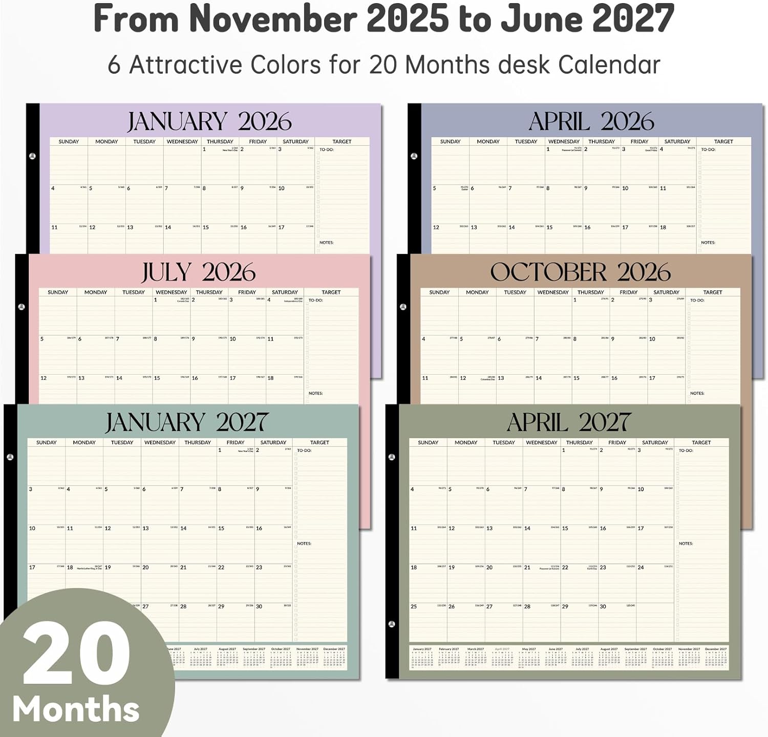 22″ x 17″ Extra Large Calendar: Desk calendar 2026 runs from November 2025 through June 2027, featuring 20 months for long planning. 22″ x 17″ overall size Desk calendar 2026 with large grid, big print is perfect for group scheduling or seniors.
