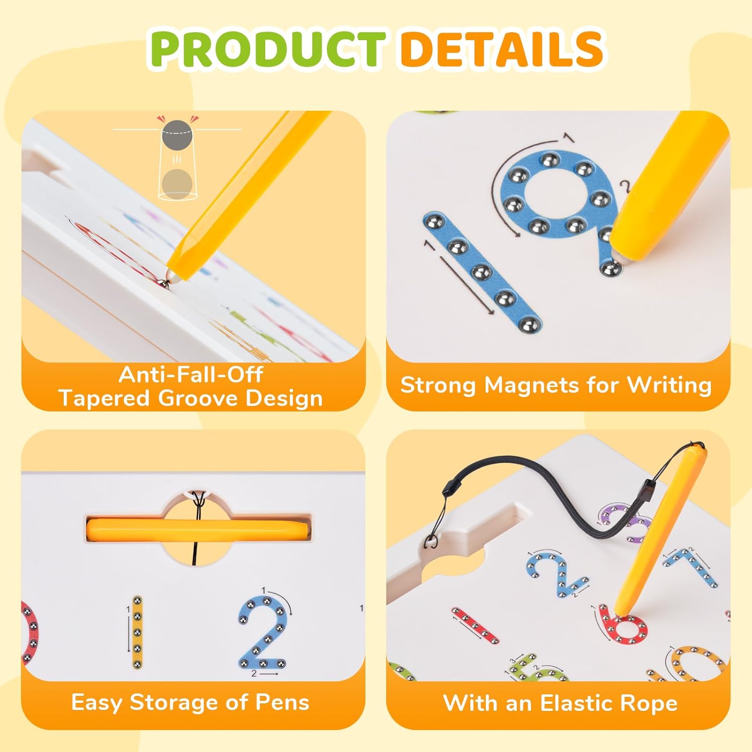 This magnetic number tracing board features durable ABS plastic with smooth, safe edges and a secure, anti-fall groove design.