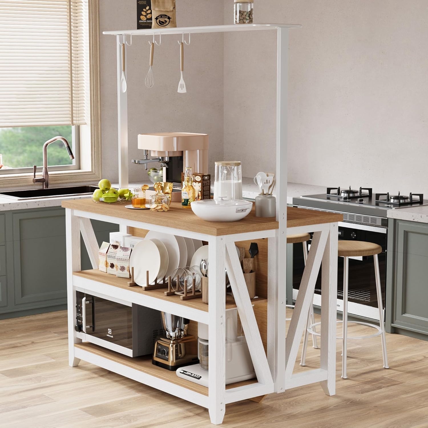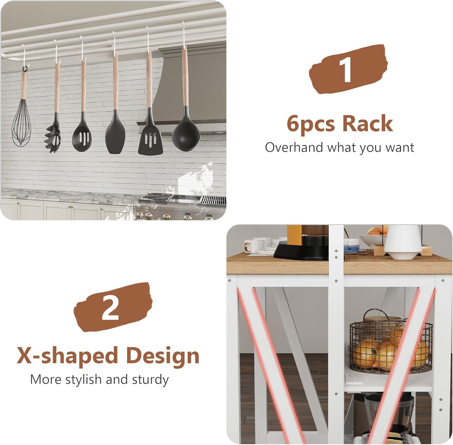 【Sturdy & Stylish Design】Crafted from premium wood, this island boasts 40mm-thick support legs and a 30mm-thick top panel for long-lasting durability. The white frame paired with warm light-brown wooden planks showcases natural grain textures, blending rugged resilience with modern farmhouse charm to elevate any kitchen or living space.
