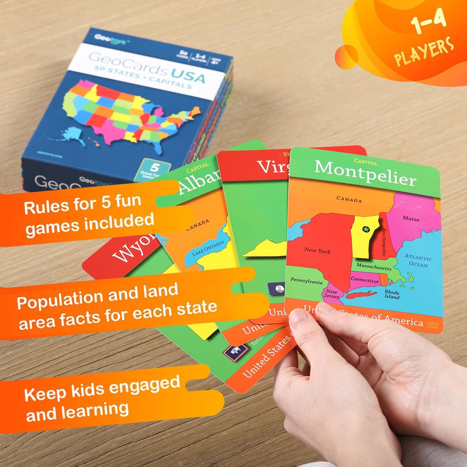 GeoToys GeoCards – USA Geography Flash Cards, Kid Card Games for Home, School & Travel, States & Capitals, Ages 4+