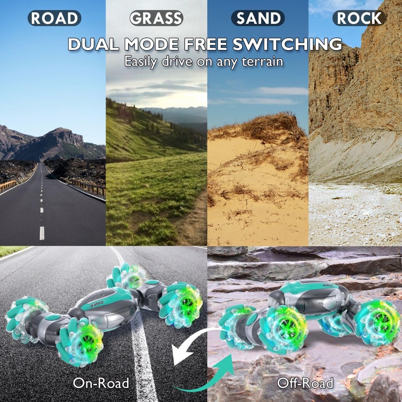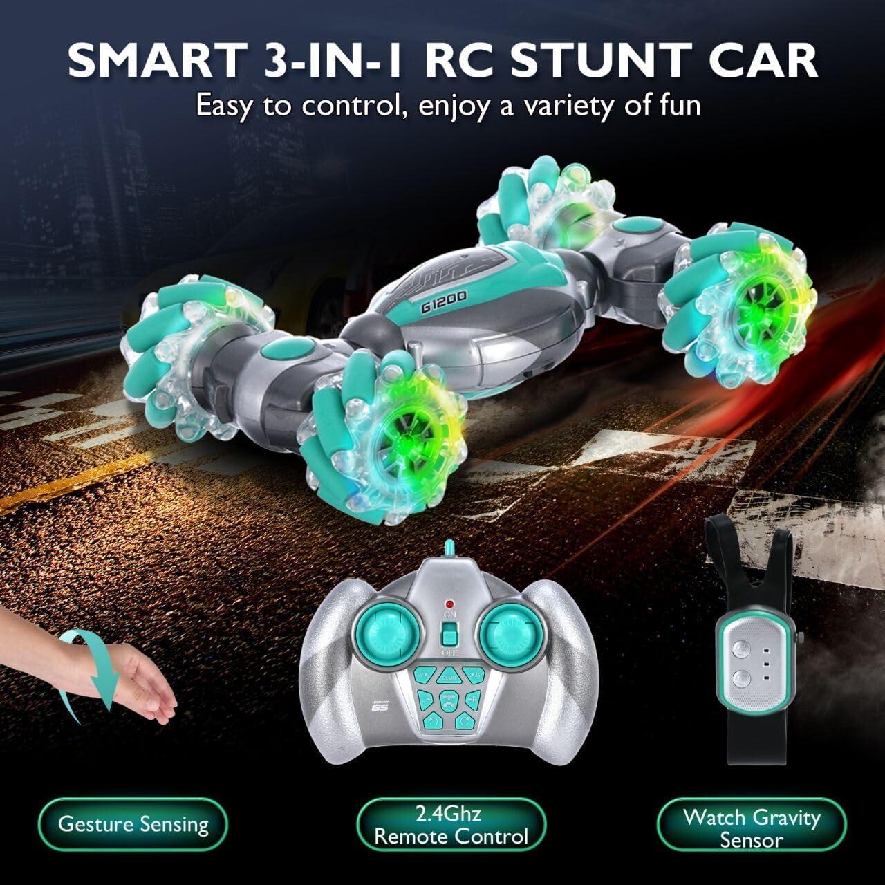 🎄【Smart 3-in-1 RC Stunt Car】2.4Ghz handheld remote control, gravity sensor watch and gesture sensor can be switched at will. Even if the small RC twist car is 30 meters away from you, achieving all-round drifting, flexible sideways walking, 360° rotation, and double-sided driving.