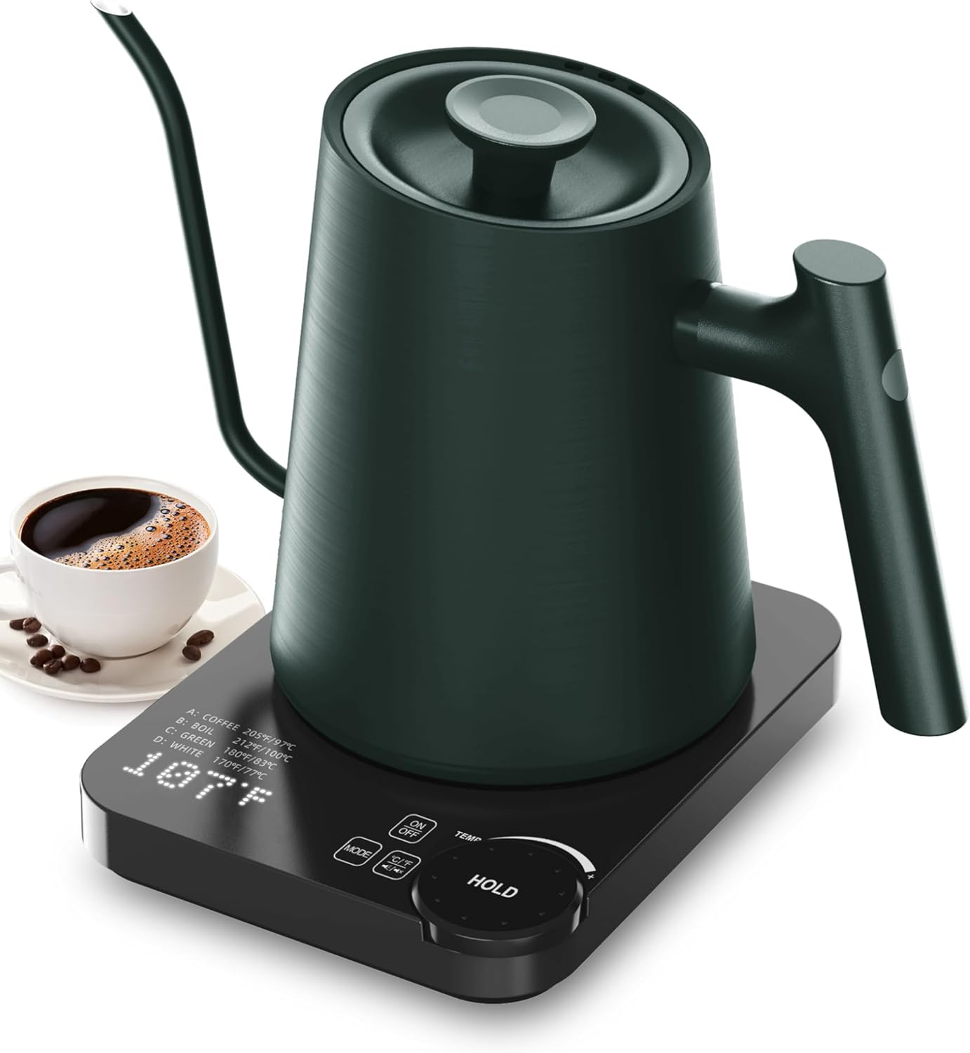 Always Know the Exact Temperature: Get real-time, precise target temperature readings through the LED panel hidden on the base of the electric gooseneck kettle. With a measurement accuracy of ±0.9°F, you can use the dial to adjust the water temperature with precision control, helping you brew beverages with exquisite flavors. The gooseneck electric kettle is a great Christmas gift for your family and loved ones.
