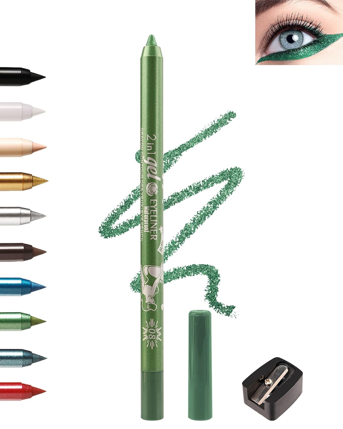 Green Eyeliner Pencil Gel, Sharpenable Multi-Use Colorful Eyeliner Waterline Waterproof Smudge-Proof Long Stay, High Pigmented Shimmer Cream Eye Liner Pen with Sharpener, Safe for Sensitive Eyes-08
