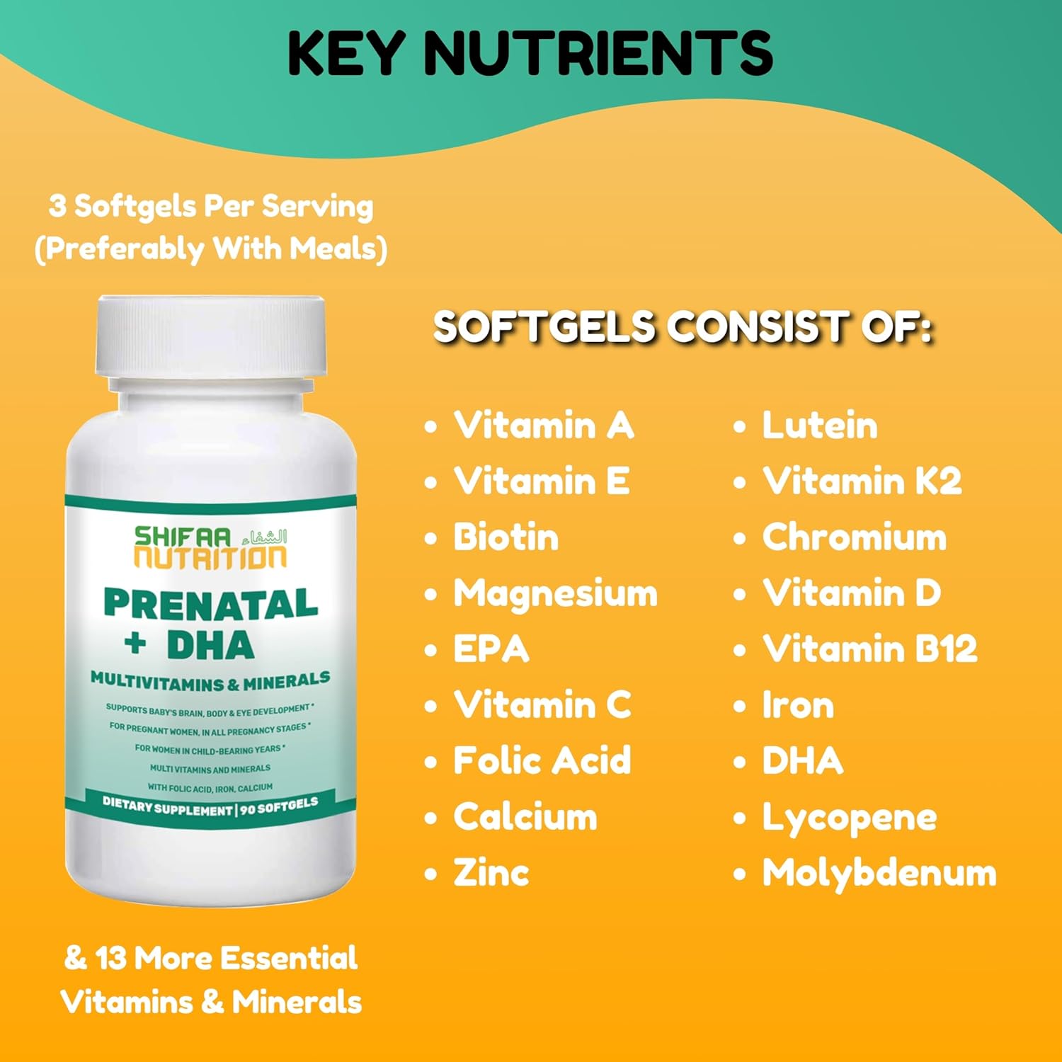 HIGH POTENCY FOR ADEQUATE DEVELOPMENT: High In Potency To Support All Development and Defense Mechanisms: DHA 250mg, EPA 90mg, LUTEIN 500mg, FOLIC ACID 800mg, IRON 27mg (Free From Bisglycinate), Iodine 150mg, Vitamin A 5000IU, Vitamin C 120mg, and Calcium 400mg. Other Vitamins and Minerals: Vitamin A, D3, K, B1, B2, B3, B5, B6, B12, Biotin, Magnesium, Zinc, Selenium, and More.