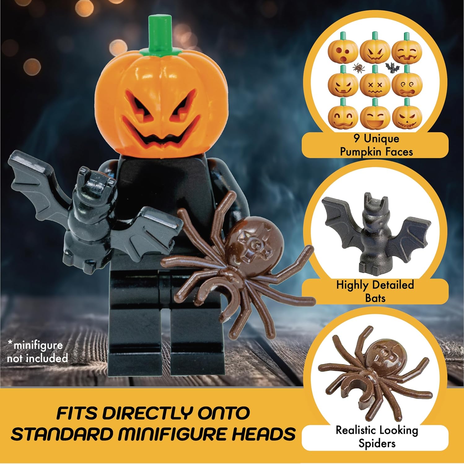 Fits onto Standard Minifigure Heads Perfectly: Our Minizfigs Halloween Pumpkin Jack-O-Lantern, Bats & Spider Accessories are compatible with all major brands including halloween sets, minifigures, haunted house, ghost sets and all other similar sets or items.