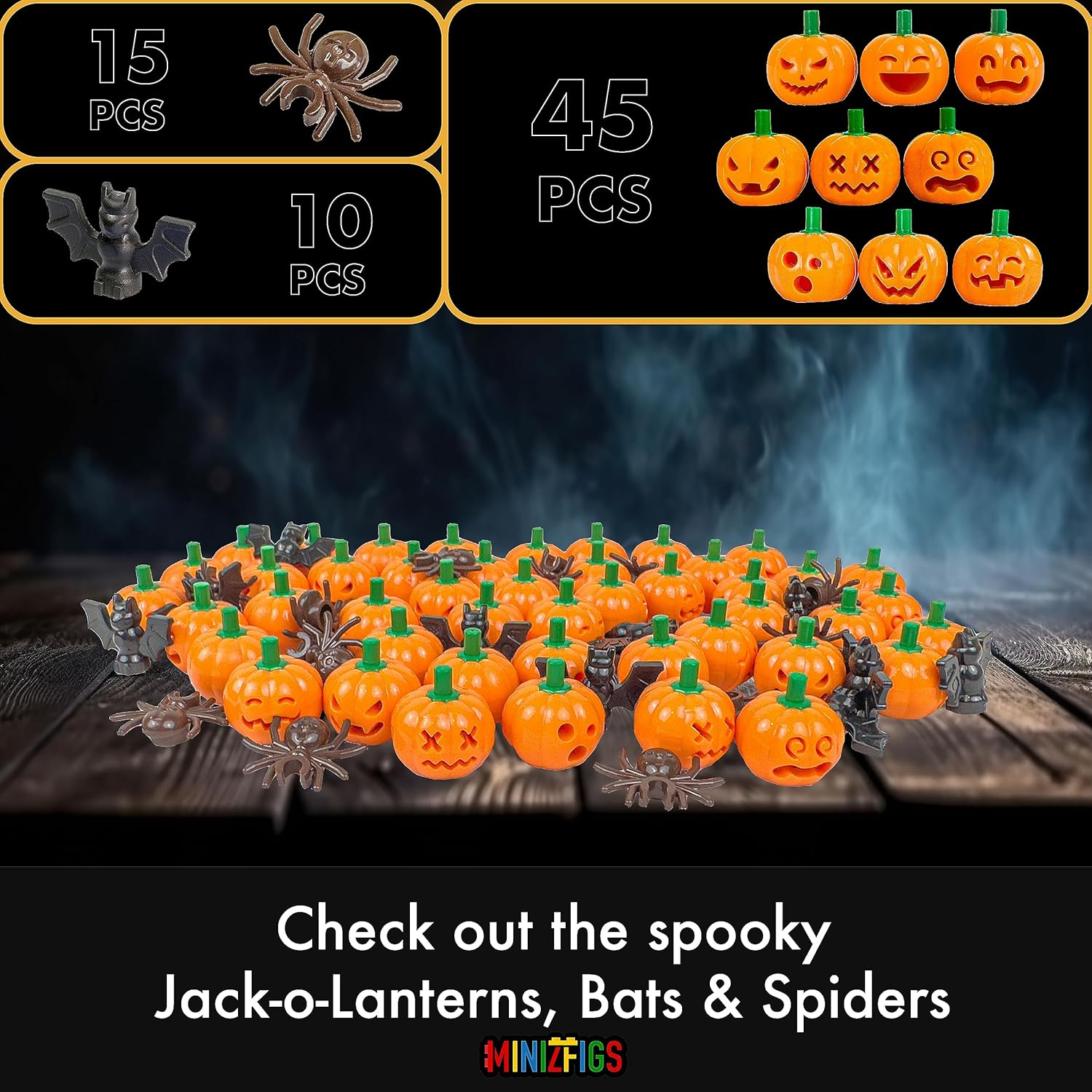 9 Unique Pumpkin Faces: you will find a variety of fun faces amongst the 45 orange pumpkin jack-0-lanterns, 10 black bats, 15 brown spiders included in this fun set, keeping the creepy vibes flowing, fits perfectly onto most minifigure heads, building toy sets and accessories.
