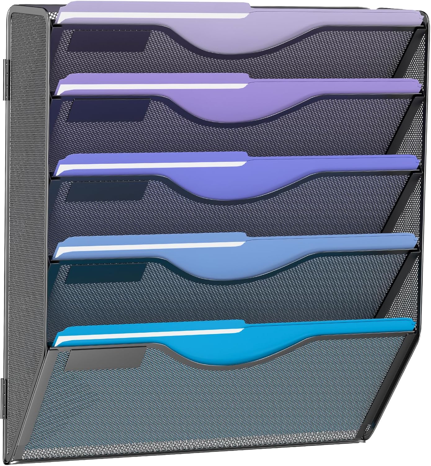 ✏️ Multiple Compartments: 5-tier wall-mounted file organizer for storing files, with small label panels to mark the contents of each layer and 1 flat tray for small tools or supplies.