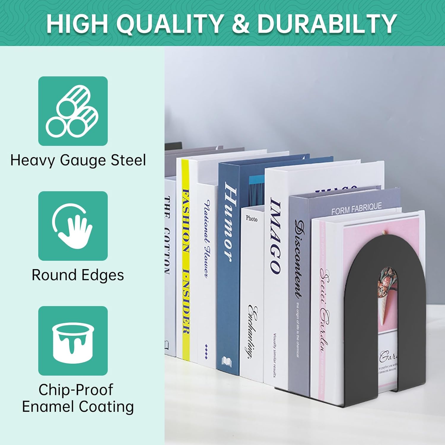 Scratch Resistant Finish: These heavy duty bookends are coated with a scratch and chip-resistant powder finish so they can be used for years to come. Perch them high on a bookshelf or use on your office desk