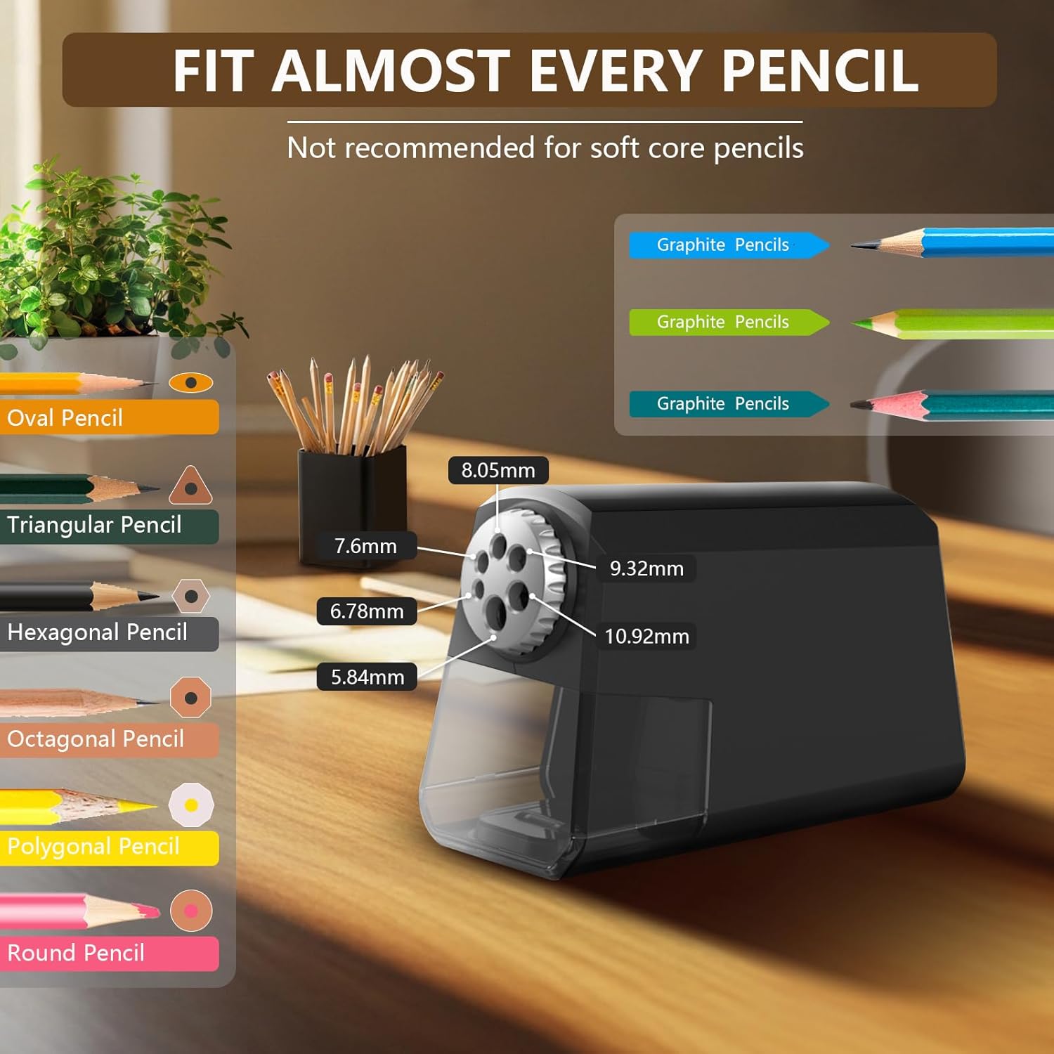 Versatile 6-Hole Design: 6-hole input fits 6–11mm pencils and colored leads – a versatile electric sharpener for schools and workplaces