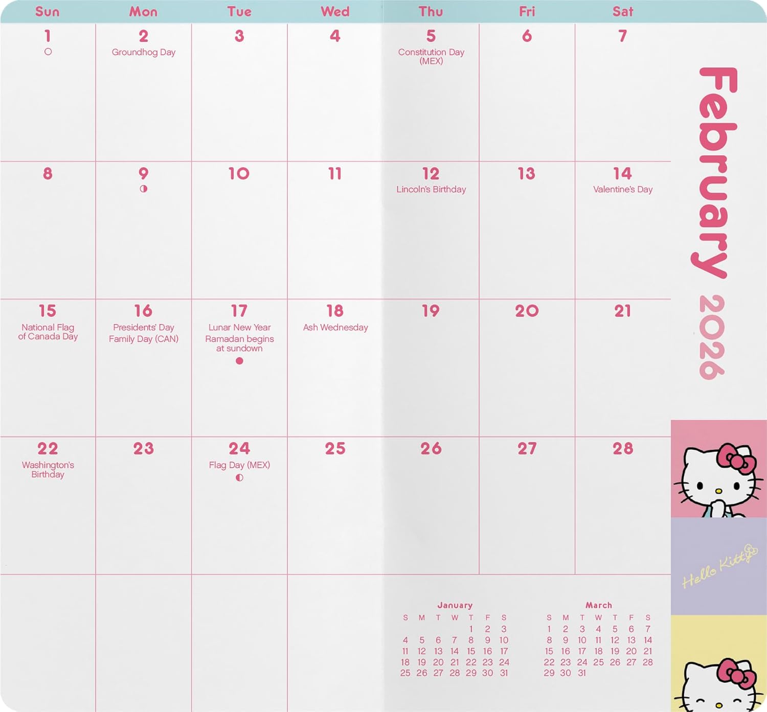 This 2026 Hello Kitty calendar is printed on premium heavyweight deluxe paper. Large grids to mark appointments and events. Observes major holidays and moon phases. This Hello Kitty 2026 pocket planner calendar measures 3.5 x 6.5 inches closed and 7 x 6.5 inches opened.