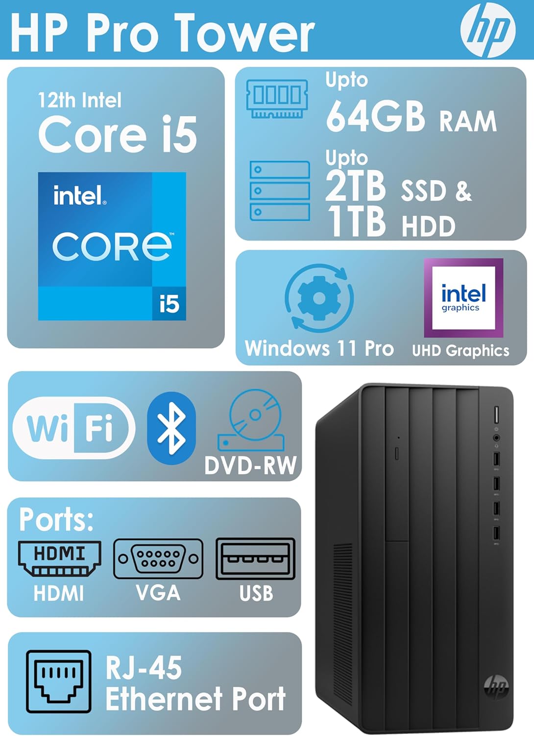 HP Desktop Tower Pro | Intel Core i5 (6-Core Turbo-Boost 4.4GHz) Processor | 64GB RAM, 3.0TB Storage | Wi-Fi, Bluetooth | HDMI, USB, VGA, DVD-W, RJ-45| Keyboard & Mouse Included| Wins 11 Pro
