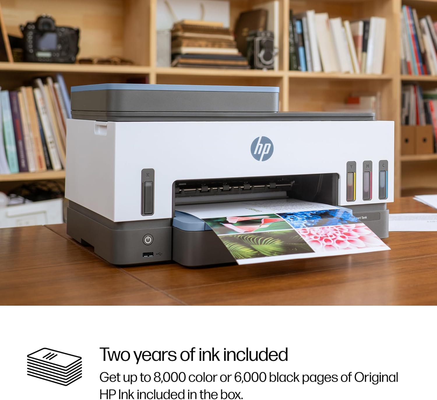 The HP Smart Tank 7602 Printer is a smart, connected and refillable tank printer that makes printing seamless for your home and small business with its high capacity, wireless connectivity and Ethernet networking. Create everyday color documents at a low cost with 2 years of Original HP Ink included in the box. This Smart Tank printer is an inkjet perfect for high-volume printing.