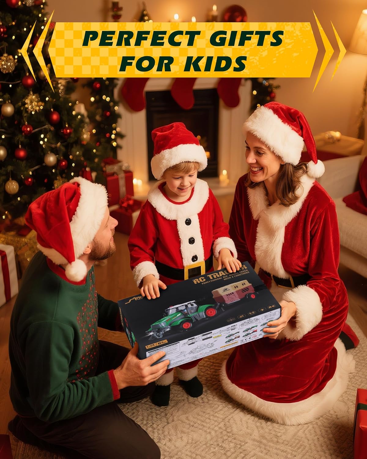 All-Terrain Wood Transport: This 4-channel RC tractor responds instantly to forward, backward, left, and right commands, providing a smooth and realistic driving experience.No yard is too tough! The high-traction wheels and powerful motor handle grass, gravel, and slopes with ease, while the sturdy trailer ensures every load of animals or goods arrives safely