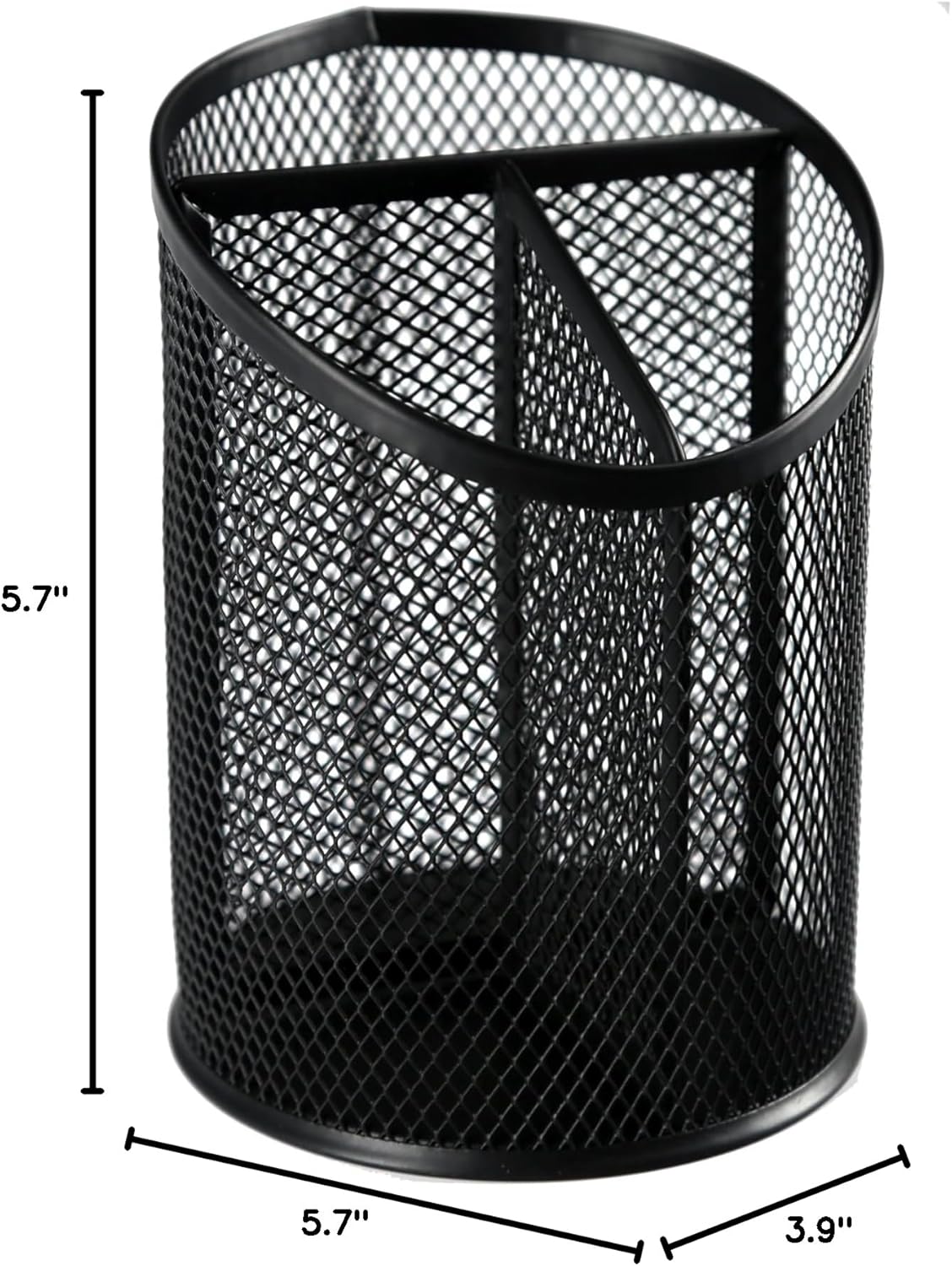Huron Black Minimalist 3-Compartment Metal Mesh Pen and Pencil Holder Desk Organizer