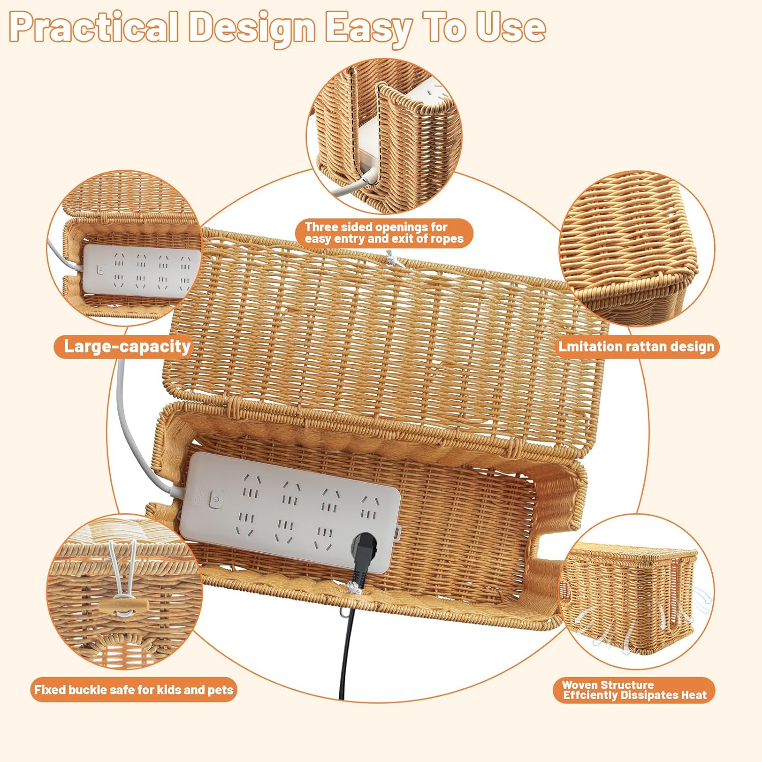 EFFICIENT HEAT DISSIPATION:Pure Hand-Woven Imitation Rattan Craft Cable Organizer,Which Has Excellent Heat Resistance And Efficient Heat Dissipation. Its Unique Weaving Process Not Only Improves The Overall Aesthetic But Also Elevates Your Space With A Delightful Touch, Keep Cables Organized,Helping To Maintain A Clutter-Free And Tidy Space.
