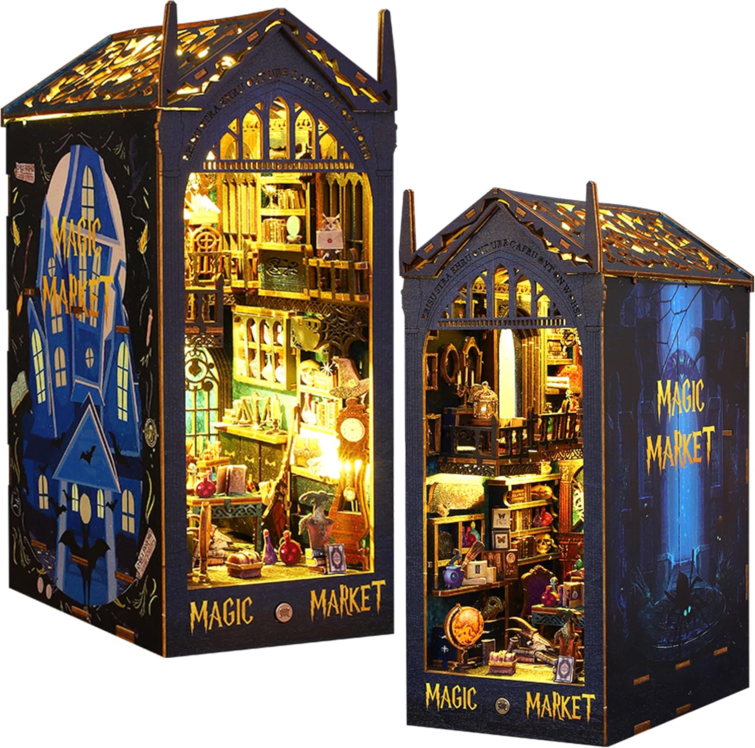Magic Castle Dollhouse Miniature House Kit: Immerse yourself in a world of mystery and magic with our DIY book nook miniature kit. In this magical market, there have magic potions, mirrors, clocks, flying broomsticks, cats, owls, fireplace flames, etc