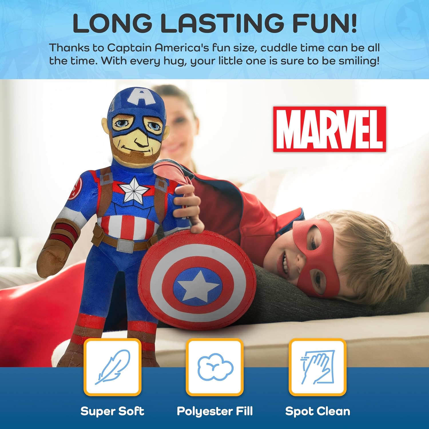 SUPER SOFT & GREAT SUPPORT – Toddler pillow buddy measures 19 x 10 x 4 inches and 13 inches when sitting. Made of 100% polyester microfiber, this Captain America pillow buddy provides great support for any child. This plush stuffed pillow is comfortable to cuddle with whether in the car, school, or in your home.