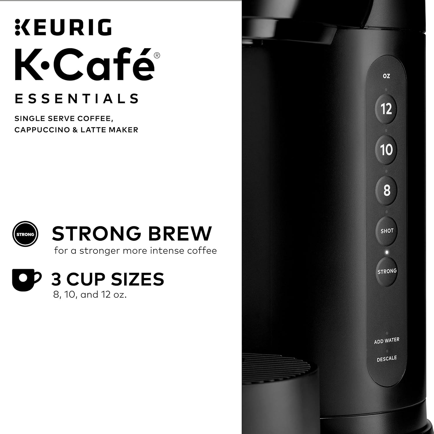 There’s nothing like taking time out of your day to relax and reward yourself with a delicious latte or an indulgent cappuccino from your local café, because after all, you deserve it. With the new K-Cafe Essentials Coffee Maker, you can easily brew delicious coffee or treat yourself to coffeehouse drinks anytime – from vanilla lattes to soothing cappuccinos, you can bring the coffeehouse home for a fraction of coffee shop prices. For specialty coffeehouse beverages, select the SHOT button for a 2 oz concentrated coffee shot. Then, use our built-in frother to add your favorite milk or dairy alternative, like oat, almond, or soy, and you’ll be savoring delicious barista-quality taste within minutes. Compatible with all of unsurpassed coffee varieties, just pop in any K-Cup pod, select your size, and choose the option of adding bolder flavor by pressing the STRONG button. Enjoy coffeehouse favorites for a fraction of the price, with the K-Cafe Essentials Single Serve Coffee, Latte & Cappuccino Maker. Available exclusively at Walmart.MAKING A LATTE OR A CAPPUCCINO In 3 easy steps: BREW your favorite pod.FROTH any milk of your choosing using the built-in milk frother.ENJOY your 3-step specialty beverage!