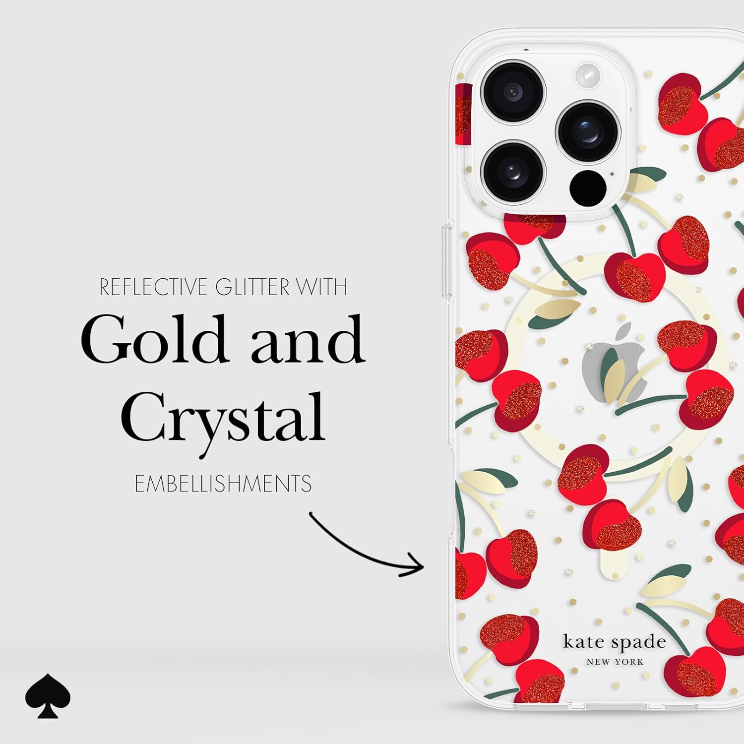 Introducing the stunning kate spade new york case for iPhone 16 Pro Max (6.9 Inch) adorned with a cherry dot design complemented by captivating reflective glitter and delicate gemstone accents.