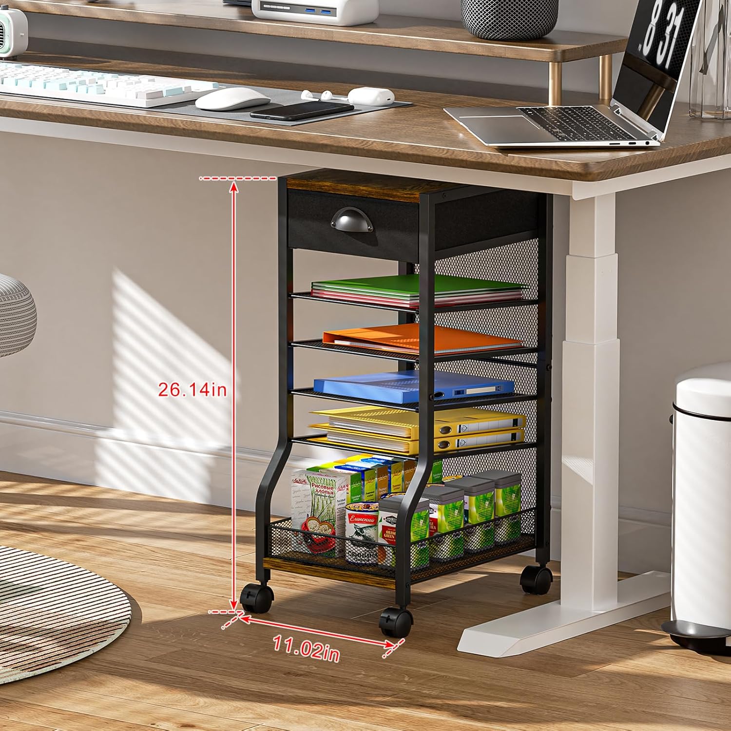 For Small Spaces and Under Desks: At 26.14 inches tall (including wheels), this under desk organizer fits comfortably beneath most standard desks. 11.02 inches width fits into small corners, maximizing workspace efficiency while keeping essentials within reach