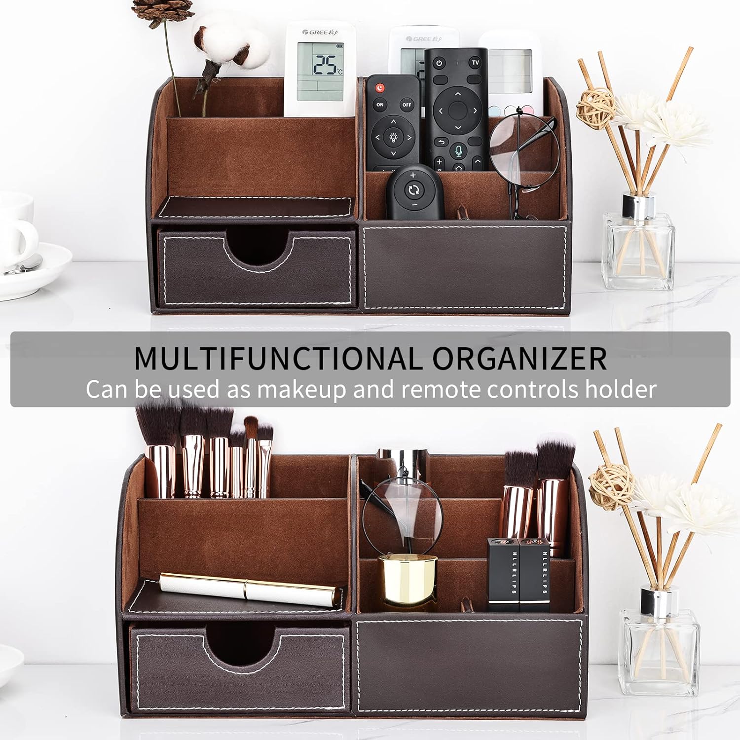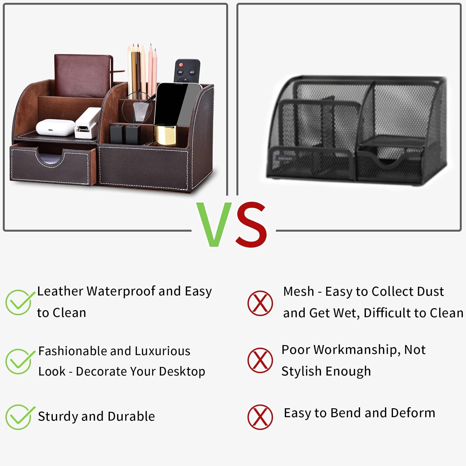 ▶ STYLISH DESIGN AND STURDY CONSTRUCTION: The desk organizer surface is made of high quality PU leather with MDF struction, and designed with stitched detailing, interior and bottom are made of soft flannel.