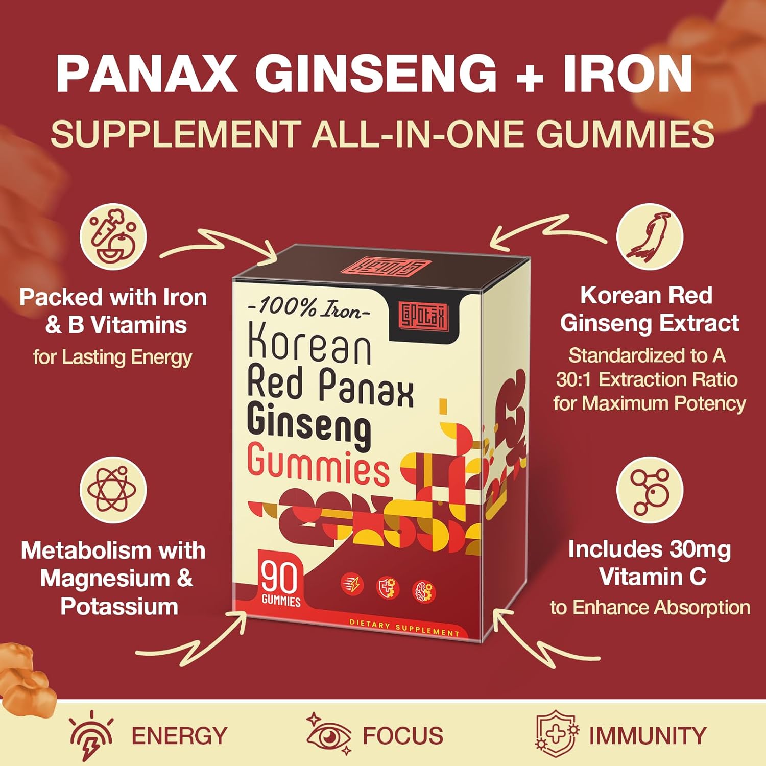 Korean Red Panax Ginseng Supplement Gummies – Iron Supplements for Women & Men – Iron Gummies with Vitamin C, B6, B12, Potassium & Magnesium, Vegan – 90 Count