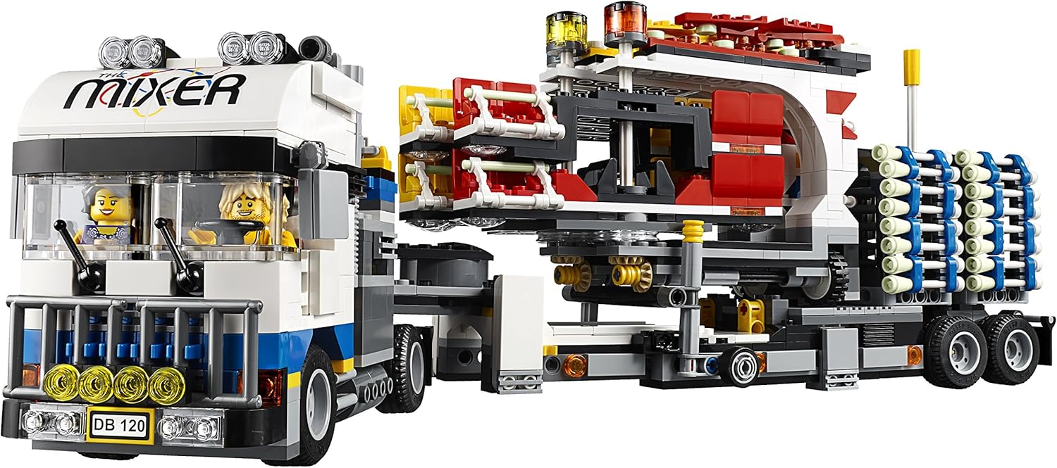 Unfold the awesome Fairground Mixer, turn the crank and see it come to life! The fair has come to town and children and adults alike can’t wait to try the rides. Buy your ticket from the ticket booth and climb aboard the Mixer. Then try reaching the golden bell on the high striker or hit the target to plunge the dunk tank lady into the water. As evening falls, the swirling Mixer ride glows in the darkness, before being folded down onto its own trailer for transportation to the next town. This magical fairground is packed with wonderful details that will capture everyone’s imagination. Includes 12 minifigures: a juggling man on stilts, dunk tank lady, strong man challenger, ticket lady, truck driver/ride operator, 2 women, 2 girls, 2 boys and a queasy man who tried the mixer one too many times. Mixer truck has opening doors, windshield wipers and removable roof to access interior with bed and TV. Accessory truck holds ticket booth, high-striker and dunk tank. Accessories include: ice cream, popsicle, lime green cherries, teddy bear, juggling pins and a large and small mallet for the high-striker