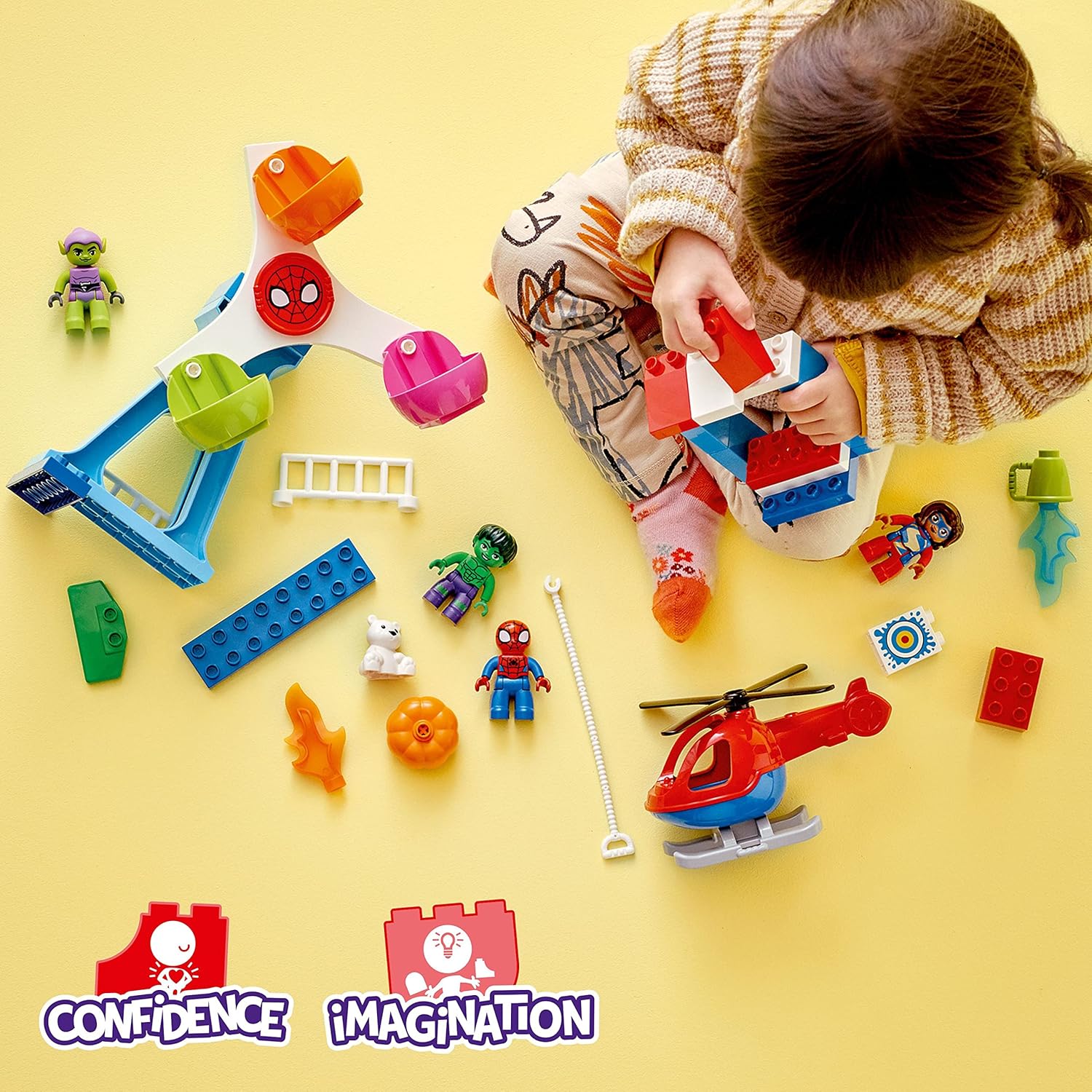 This LEGO fairground playset includes Spidey, Ms. Marvel, Green Goblin and Hulk LEGO DUPLO figures from the Marvel Universe, plus a bear figure