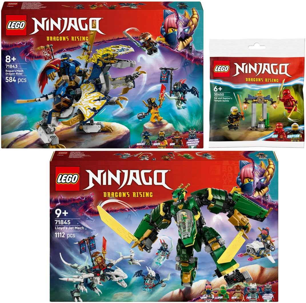 Lego Ninjago Set of 3: 71843 Rogues Mech Dragon Rider, 71845 Lloyds Jet Mech & 30650 Kais and Rapton’s Duel in the Temple