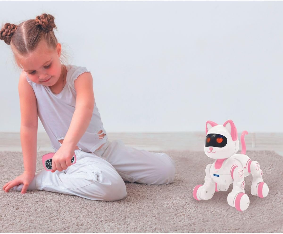 LEXiBOOK, Power Kitty Jr., Remote Control cat to Train, Waddles Like a Real cat, Interactive Eyes, STEM programmable, Rechargeable Battery, Pink/White, KIT01