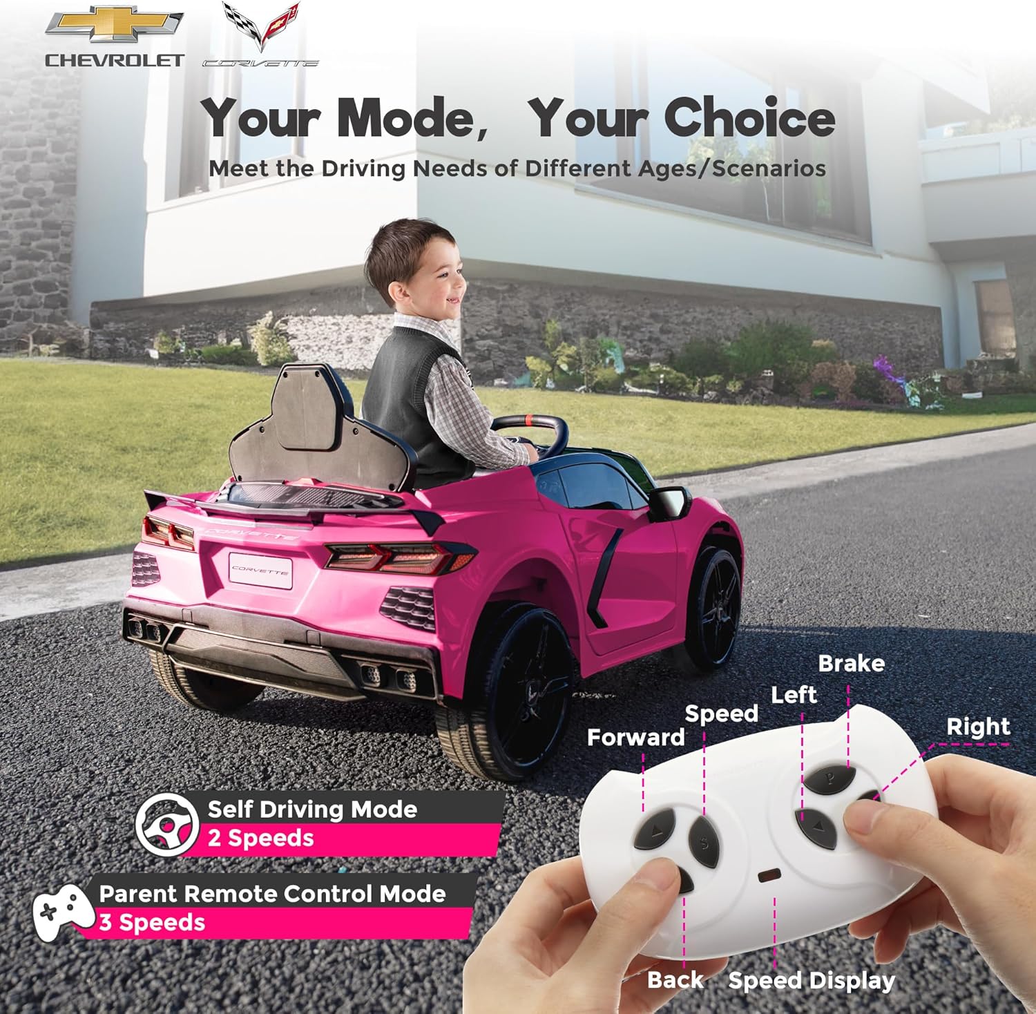 Licensed Chevrolet Corvette C8 Kids Car, 12V Kids Electric Vehicle Manual & Remote Control Modes, LED Lights, 3 Speeds, Bluetooth, Shiny Dashboard, MP3, Electric Car for Kids, Pink