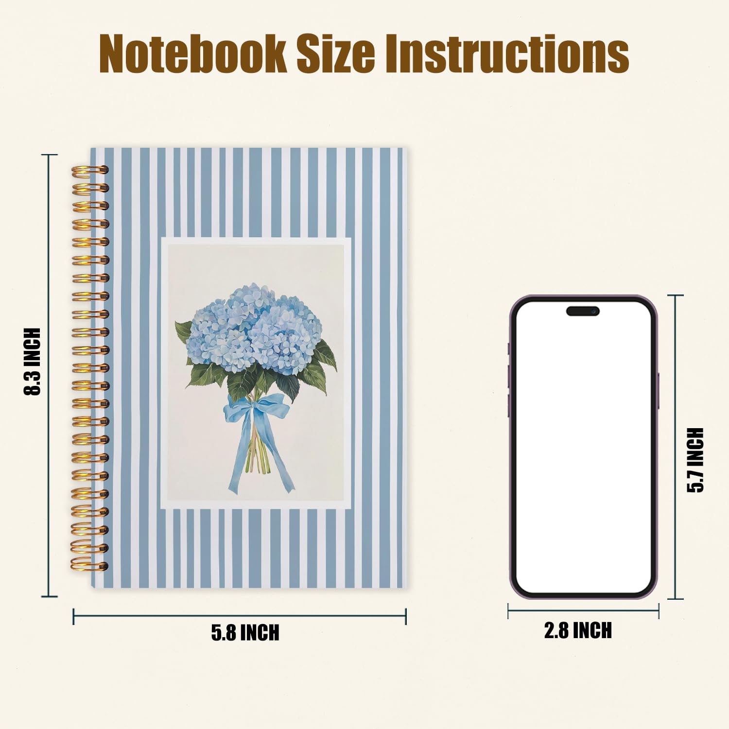 Likjad Blue Hydrangea Floral Spiral Notebook Journal 5.5×8.3, Coquette Bow Hydrangea Flower Striped Journals for Writing, Blue Office Supplies, Floral Hardcover Notebooks for Note Taking