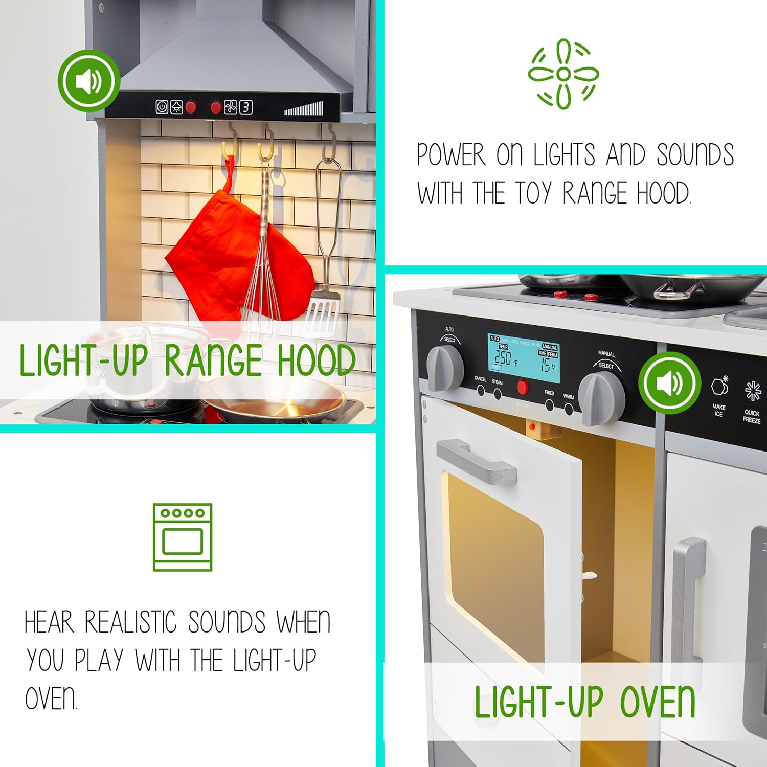 Lil’ Jumbl Jumbl Kids Kitchen Set, Pretend Wooden Play Kitchen, Includes Range Hood, Microwave, Stove Top, Oven That Make Realistic Sound & Light, Pots, Pan, Cutting Board & Utensils Included,