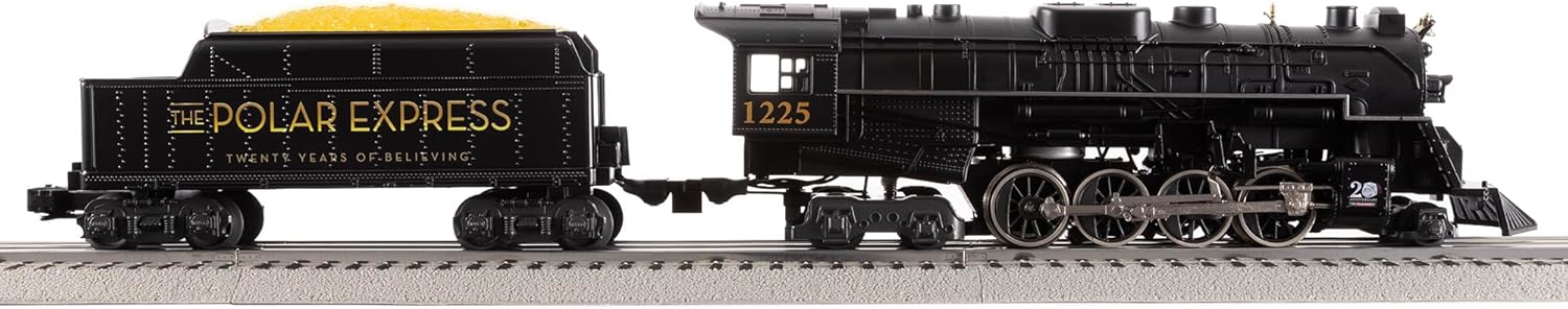 FEATURES: Electric locomotive controlled by remote / Powerful maintenance-free motor / Operating headlight / Puffing smoke unit / On/Off switch for smoke & sounds / Operating couplers / Illuminated coal load / Steam chuffing and background sounds / User-activated announcements / Window silhouettes / Interior LED illumination / Unique 20th Anniversary finish on striping / Illuminated The Polar Express 20th Logo on both sides of tender