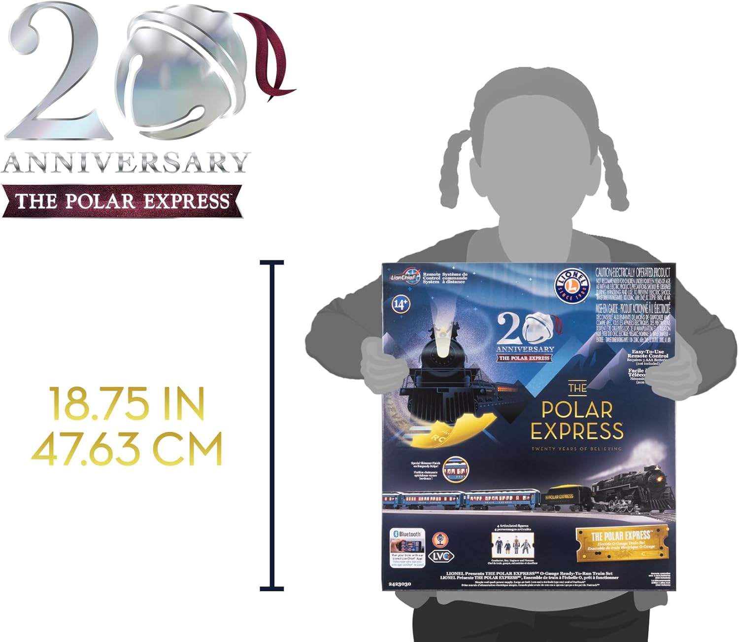 Celebrate the 20th Anniversary of everyone’s favorite Christmas movie, THE POLAR EXPRESS, with this stunning The Polar Express 20th Anniversary Electric O Gauge Bluetooth 5.0 Train Set with Remote by Lionel. Set includes (1) The Polar Express 2-8-4 Berkshire Locomotive, (1) Illuminated Tender, (2) Coach Cars, (1) Observation Car, (4) Articulated Movie Characters, (1) The Polar Express Bell, (8) Curved O36 FasTrack sections, (2) Straight Ten Inch FasTrack sections, (1) Terminal FasTrack section, (1) Plug-Expand-Play Power Lock-on section, (1) Wall-pack Power Supply, and (1) LionChief Remote. Operation Technology via the Lionel LionChief App includes Bluetooth 5.0 that allows you to operate your train via any compatible smart device. Lionel Voice Control allows you to run your locomotive by speaking commands. Voice Streaming & Recording records your own voice to generate custom train announcements, or streams your voice live through the engine. RailSounds RC Sound System controls train sounds and announcements. FasTrack System snaps together for tight, reliable connections. Features an electric locomotive controlled by remote, powerful maintenance-free motor, operating headlight, puffing smoke unit, On/Off switch for smoke and sounds, operating couplers, illuminated coal load, steam chuffing and background sounds, user-activated announcements, window silhouettes, interior LED illumination, unique 20th Anniversary finish on striping, and illuminated The Polar Express 20th Logo on both sides of tender. Remote features a forward and reverse speed control knob, (3) buttons for whistle, bell and special announcements and requires (3) AAA alkaline batteries (not included). Recommended for ages 14 years and up.
