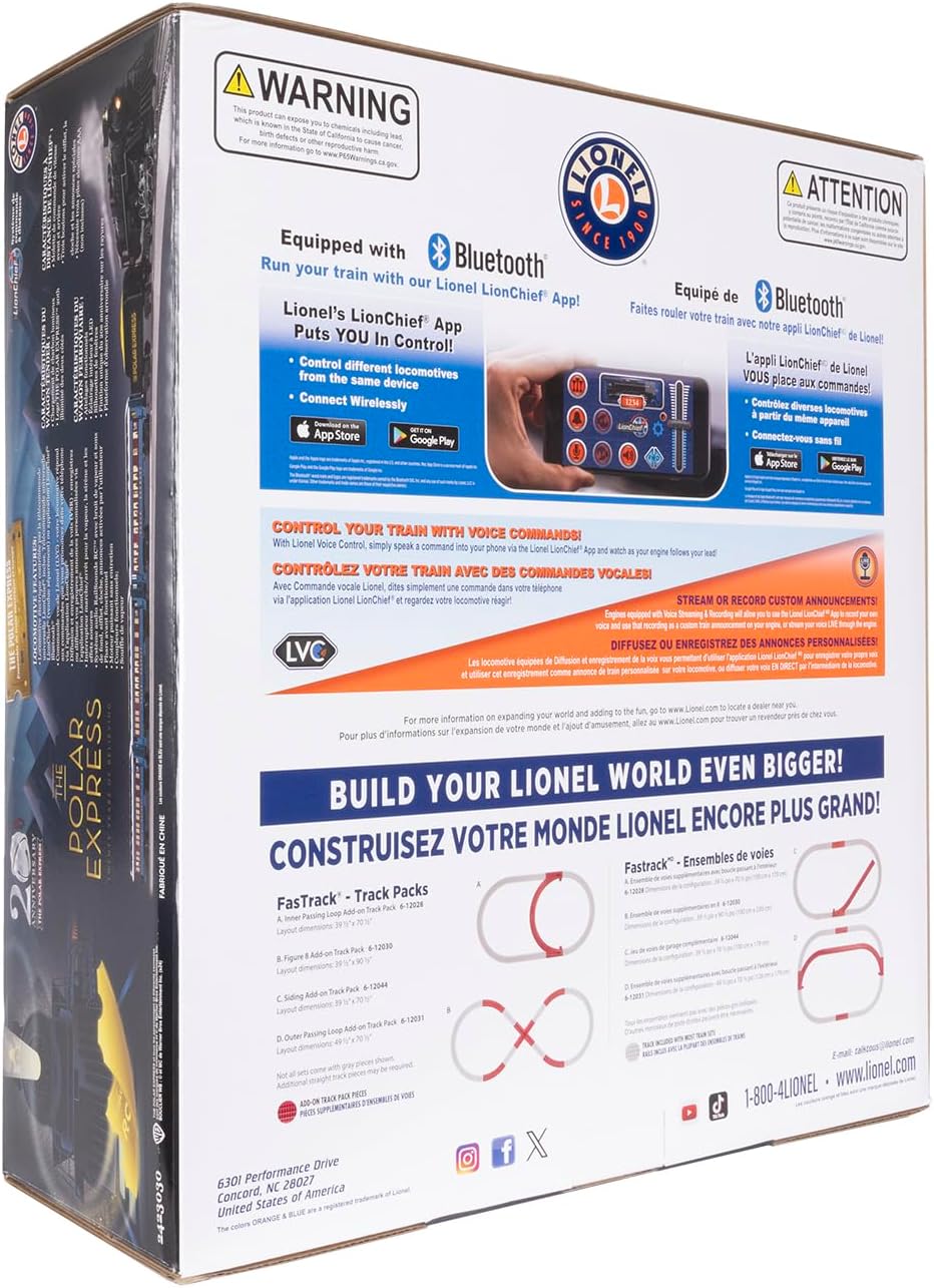 SET INCLUDES: (1) The Polar Express 2-8-4 Berkshire Locomotive / (1) Illuminated Tender / (2) Coach Cars / (1) Observation Car / (4) Articulated Movie Characters / (1) The Polar Express Bell / (8) Curved O36 FasTrack sections / (2) Straight Ten Inch FasTrack sections / (1) Terminal FasTrack section / (1) Plug-Expand-Play Power Lock-on section / (1) Wall-pack Power Supply / (1) LionChief Remote