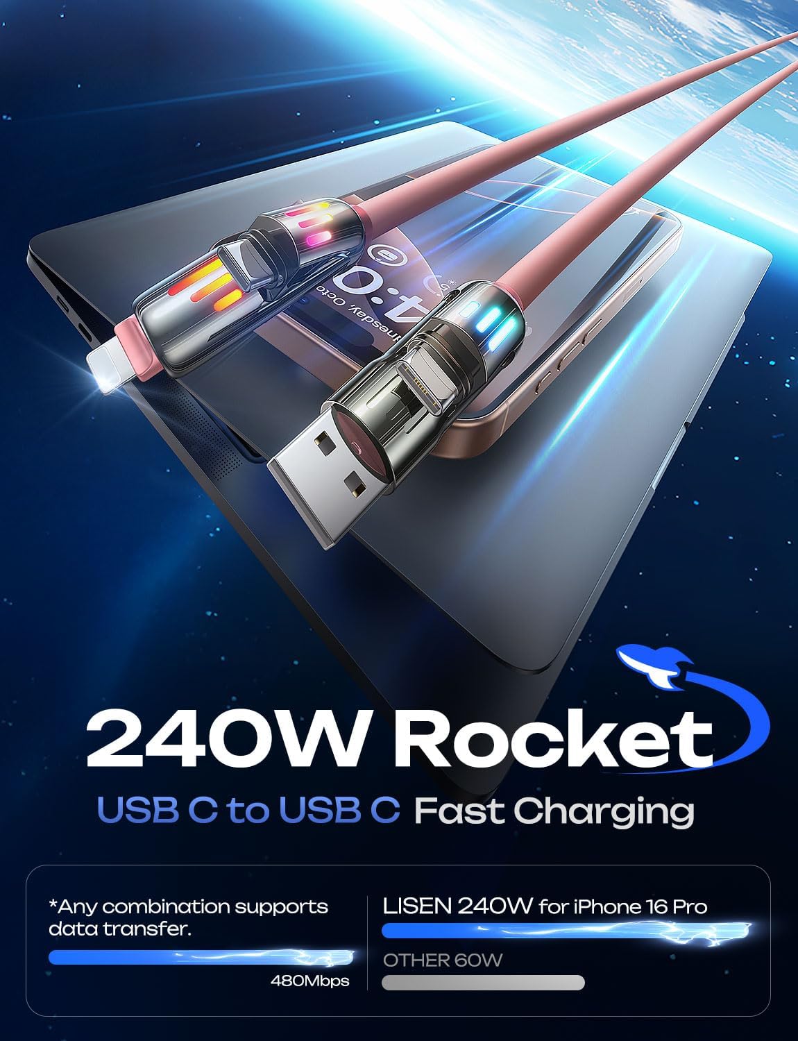 [What You Get] LISEN pink iphone charger cable 6.6FT, a length suitable for any situation, so you no longer need to stay near a power outlet. Additionally, our reliable customer service is available 24/7—if you have any questions or issues, feel free to contact us. We guarantee resolution within 24 hours. Please note, the 240W Type-C cable can power laptops through the Thunderbolt port, but it is not a USB 3.0/4K cable.