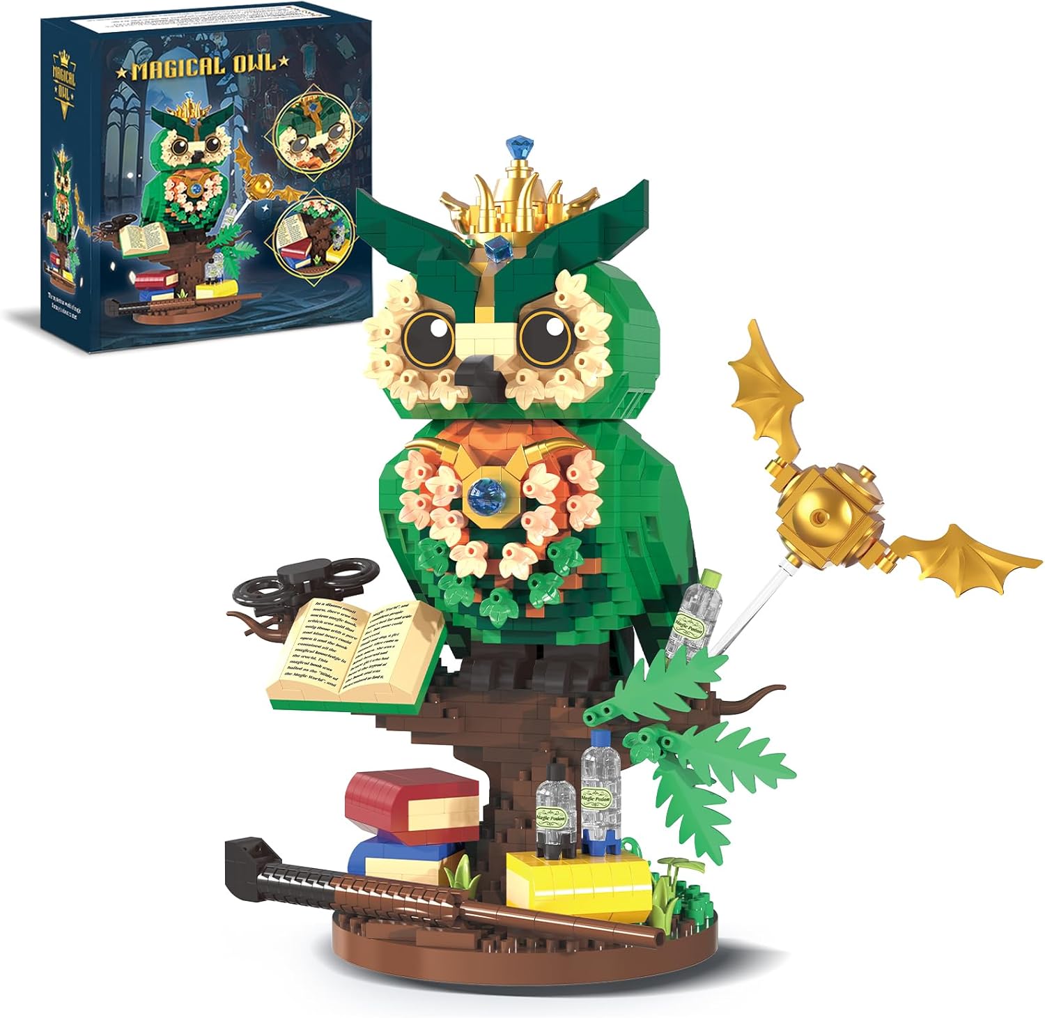 【Enchanting Green Design & Realistic Details】Inspired by the mystery of harry owls, this set features a stunning green color scheme that mimics the fresh tones of leaves and flower. The finished owl features exquisite details: its eyes are made of round bricks, looking bright and cute; its torso is layered with bricks to create a sense of depth; and its claws are firmly attached to the base of a tree to stand steadily. Every detail brings this magical owl to life, making it a striking decorative piece