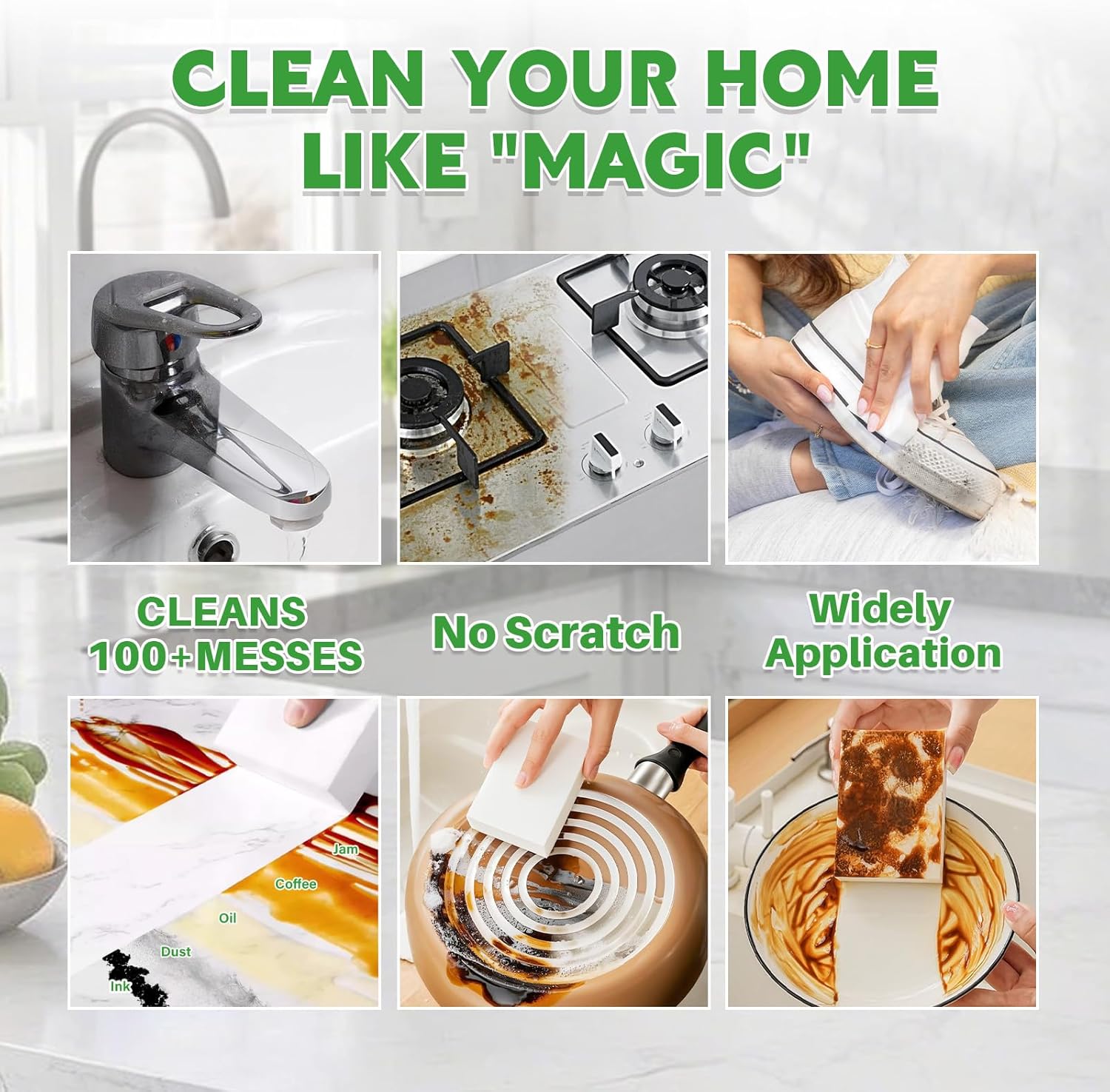 Non-Scratches & Good Absorbency : Our melamine sponges are made of quality melamine foam, easily removes surface stains without leaving scratches. Good water absorption absorbs stains into the molecular structure of the sponge, keep your house clean and tidy