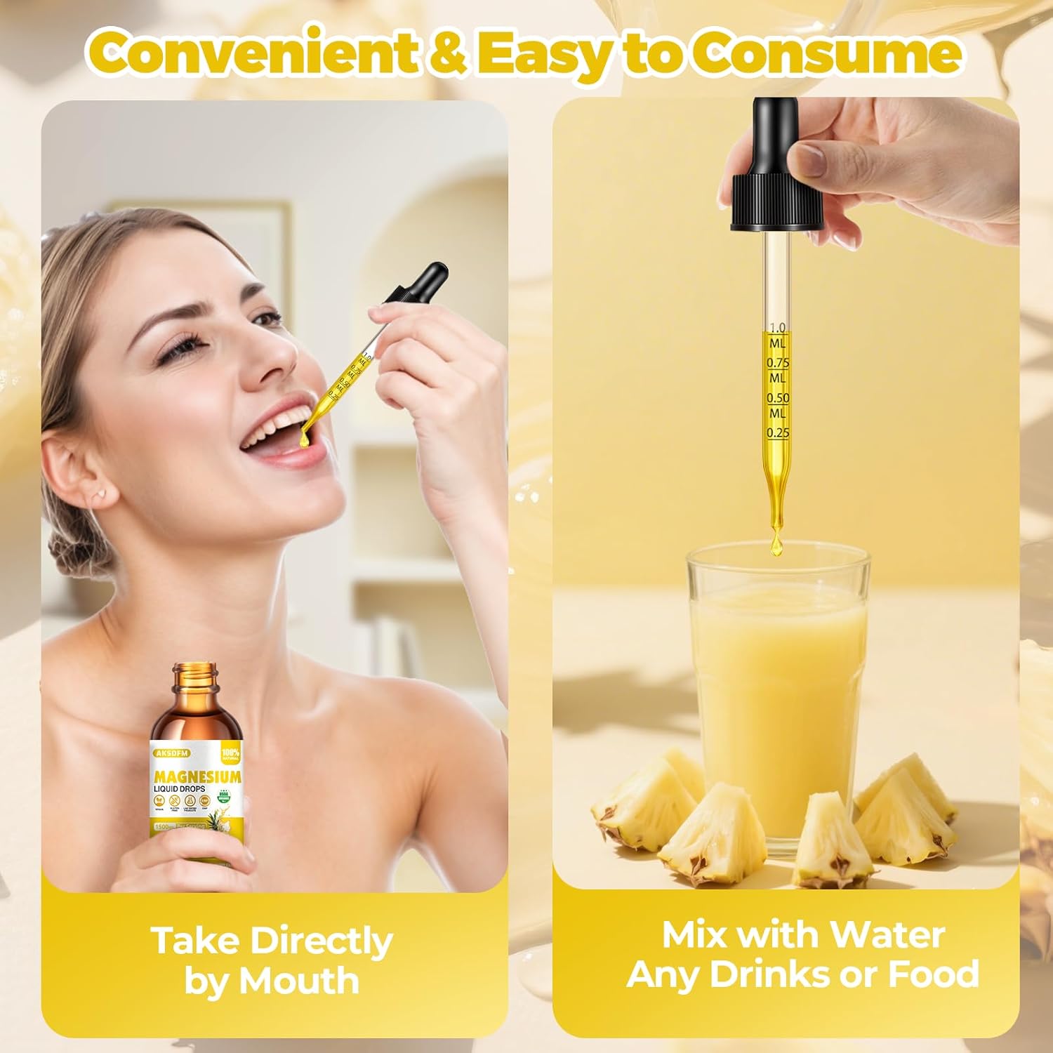 Pineapple Flavored Liquid Magnesium: Say goodbye to pills and difficult-to-swallow capsules! Just 1 drip, you are free to go. Compare with the ordinary magnesium supplement like gummies, capsules or tablets, our liquid magnesium glycinate can be easier to consume and have a comparatively higher absorption rate.