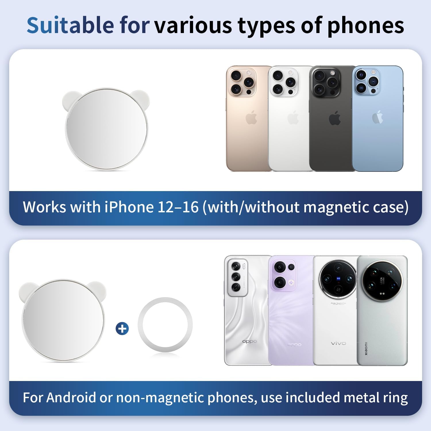 Broad Compatibility: Works with iPhone 12–16 series and includes a magnetic ring for Android and regular phone cases.