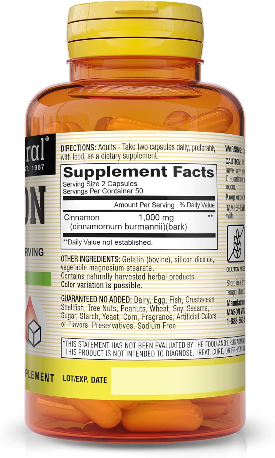 MASON NATURAL Cinnamon, 1000 mg, 100 Capsules (Pack of 3), Herbal Dietary Supplement